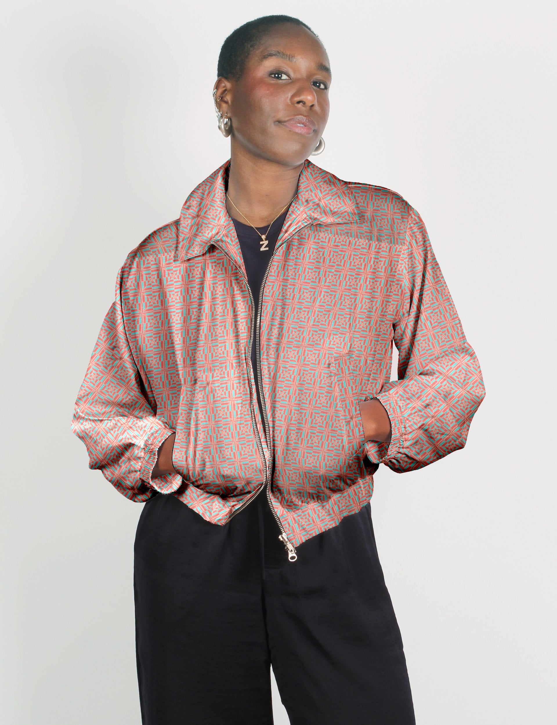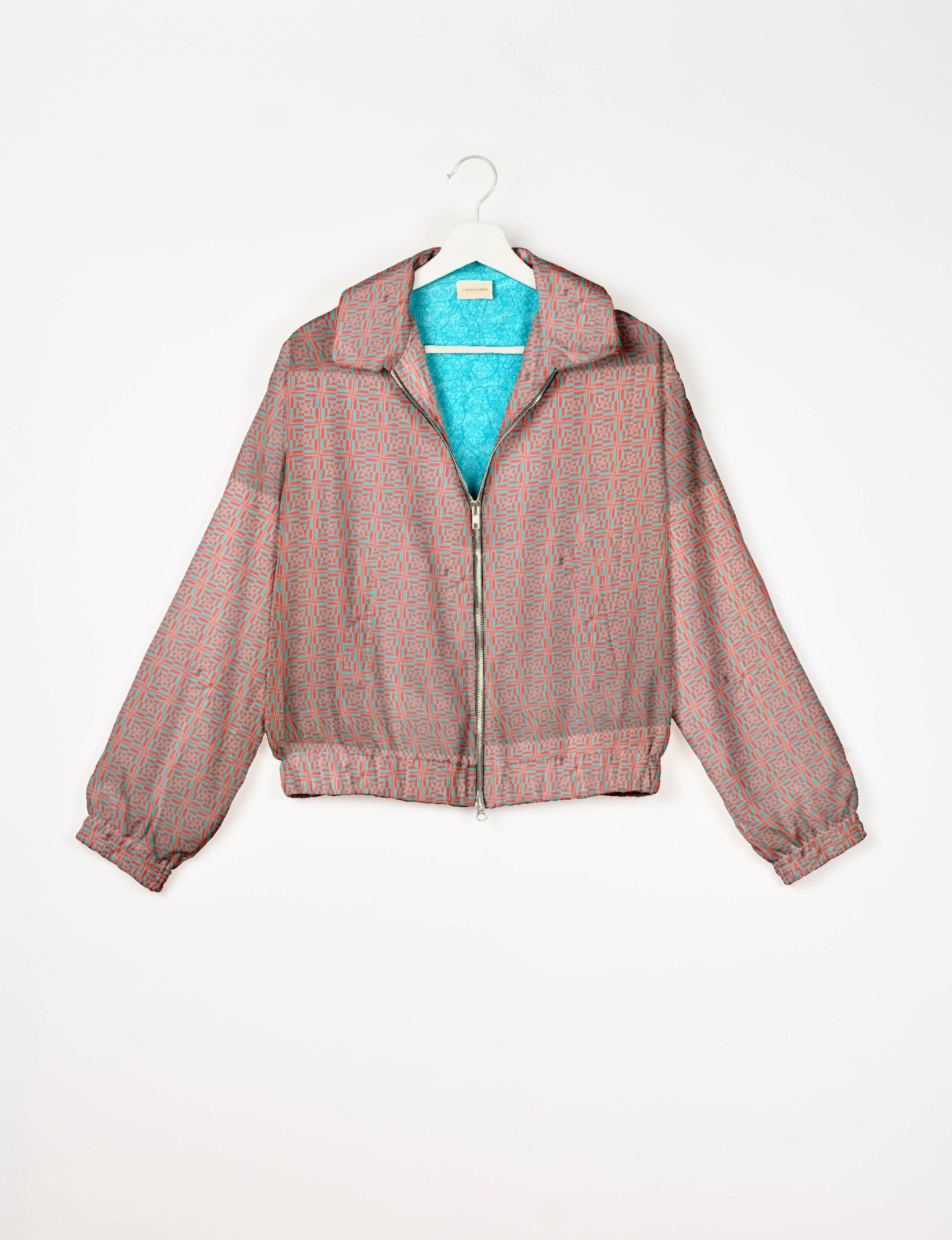 Our Bomber jacket is an iconic wardrobe essential! This military classic features a cropped shape, with elasticated bottom, hem and cuffs. It comes with 2 welt pockets and twin metallic zippers down the front. Also comes with contrast sari print lining and collar flip. Perfect layer for spring days, cool evenings, or air-conditioned workspaces without weighing you down.