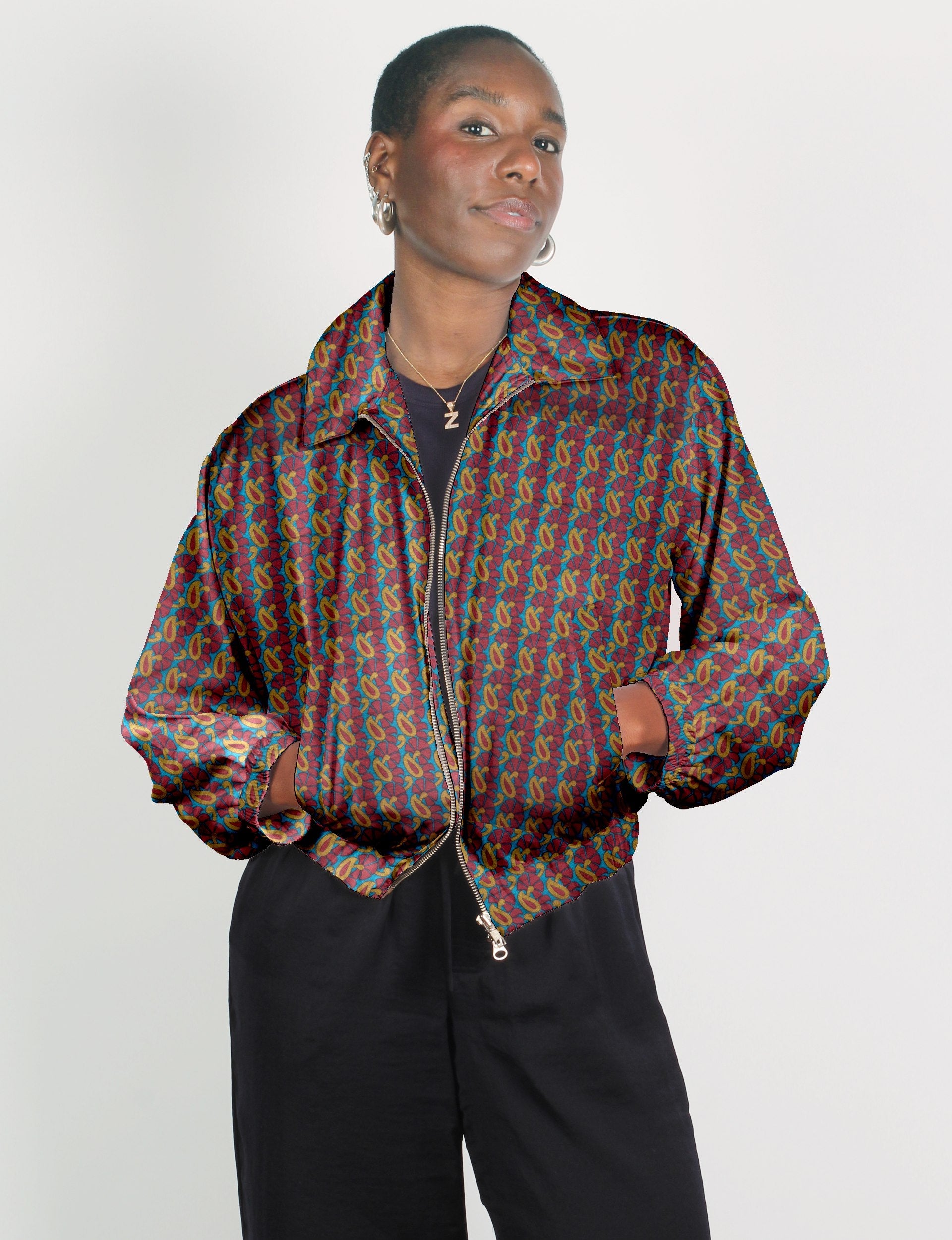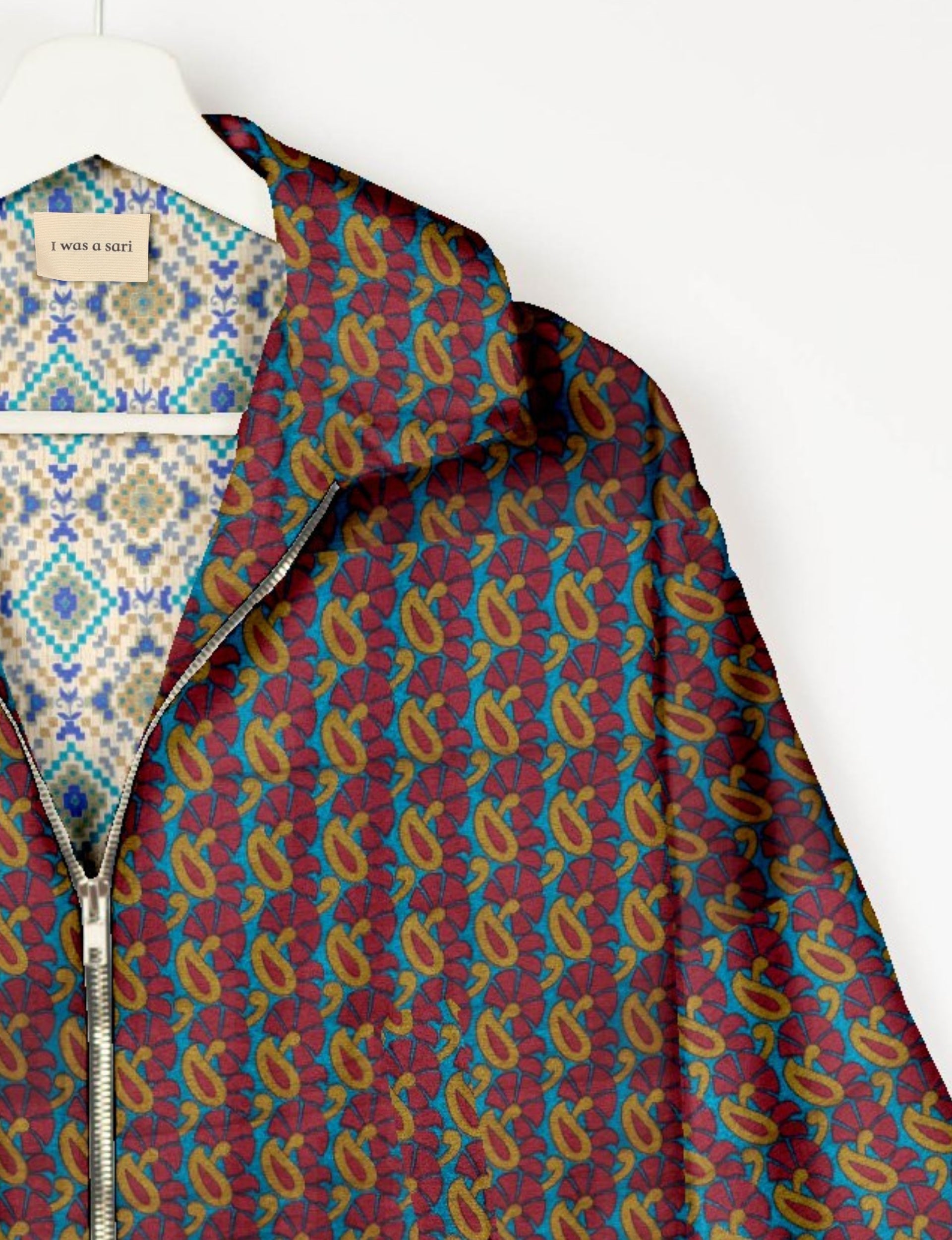 Our Bomber jacket is an iconic wardrobe essential! This military classic features a cropped shape, with elasticated bottom, hem and cuffs. It comes with 2 welt pockets and twin metallic zippers down the front. Also comes with contrast sari print lining and collar flip. Perfect layer for spring days, cool evenings, or air-conditioned workspaces without weighing you down.