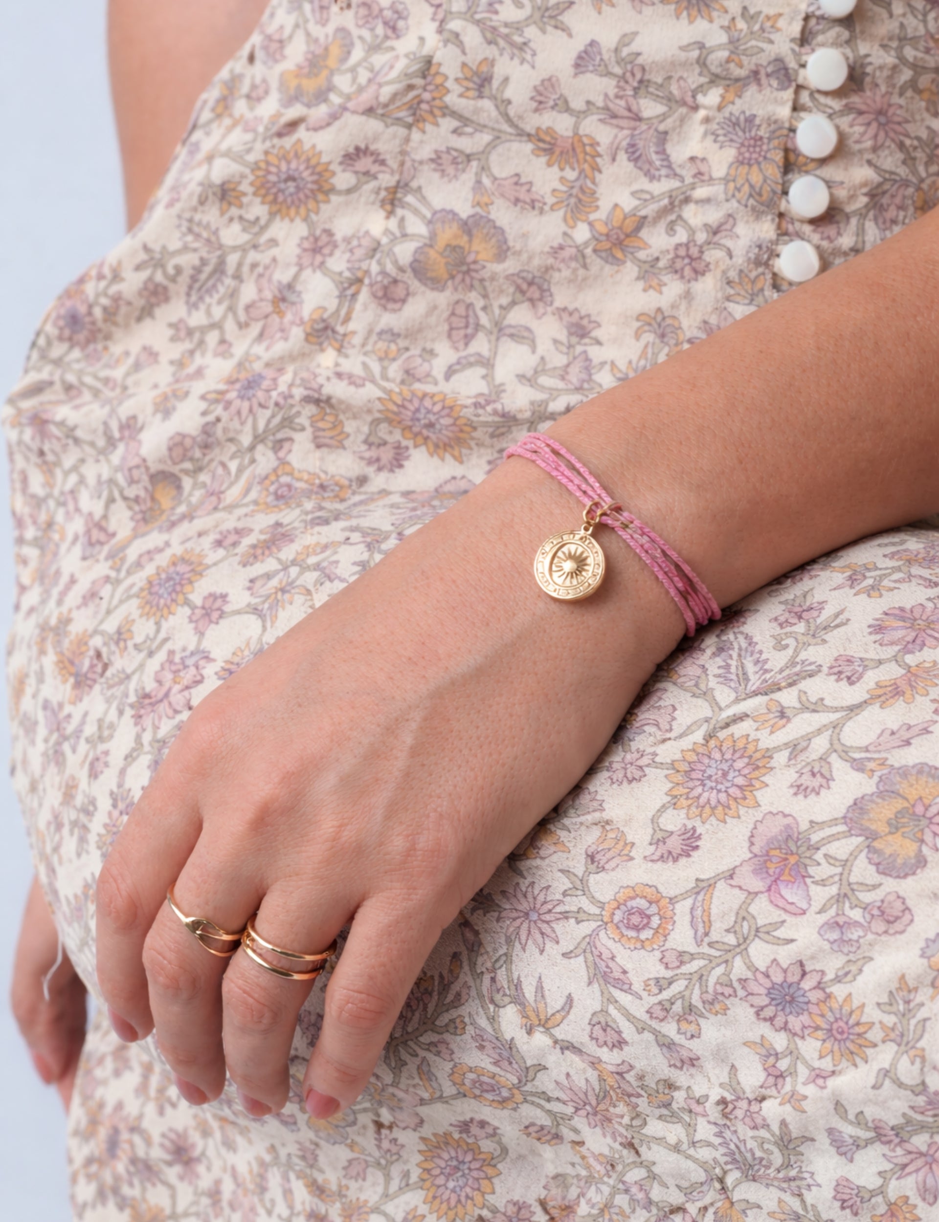 Slim cord bracelet designed to wrap around the wrist and tie for an adjustable fit. Features a single sun medallion charm suspended at the centre. Charm is stainless steel with 18K gold plating. Metal components are lead free and nickel safe. Size : L 7 cm, Charm 1.5 cm