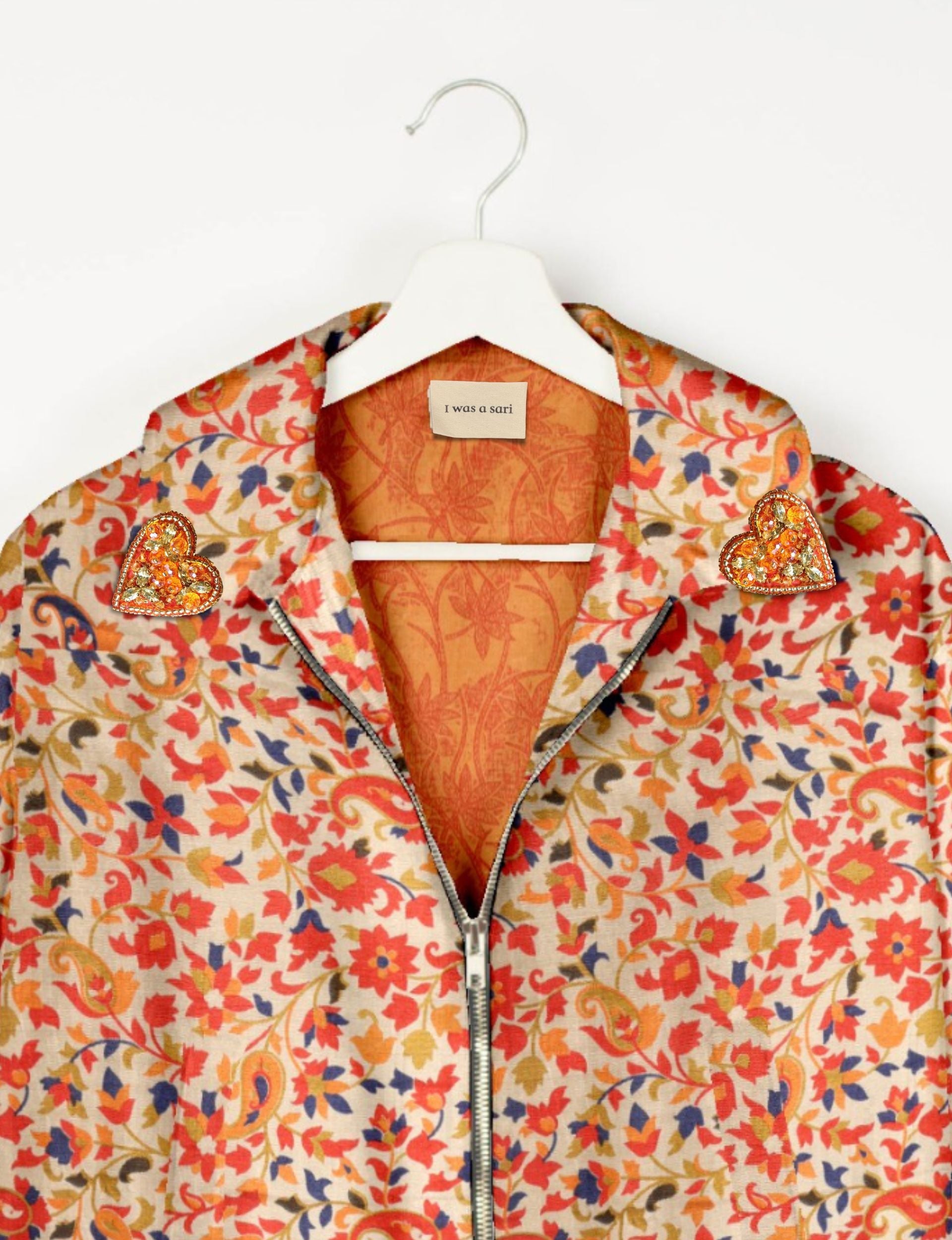 Introducing the Heart Bomber, a limited-edition sustainable fashion statement crafted from upcycled saris. Featuring intricate Aari embroidery hand-stitched by skilled female artisans, this zero waste clothing piece embodies ethical fashion and slow fashion values. Make a conscious choice with this fair trade fashion essential—eco-friendly, repurposed, and made from recycled materials. Elevate your wardrobe with carbon-neutral fashion that tells a story of artistry and sustainability. Lighting and screens may cause slight variations in color appearance.