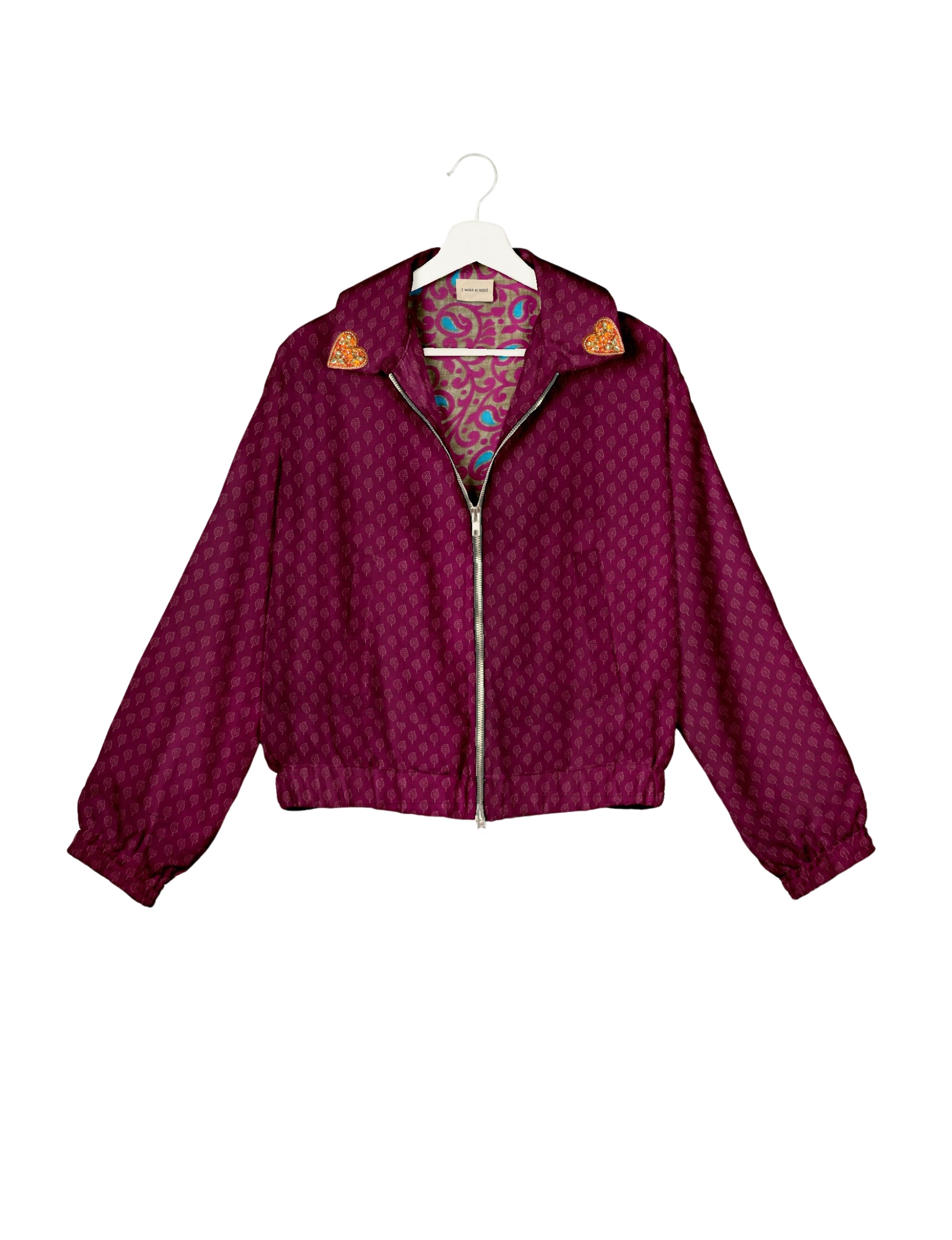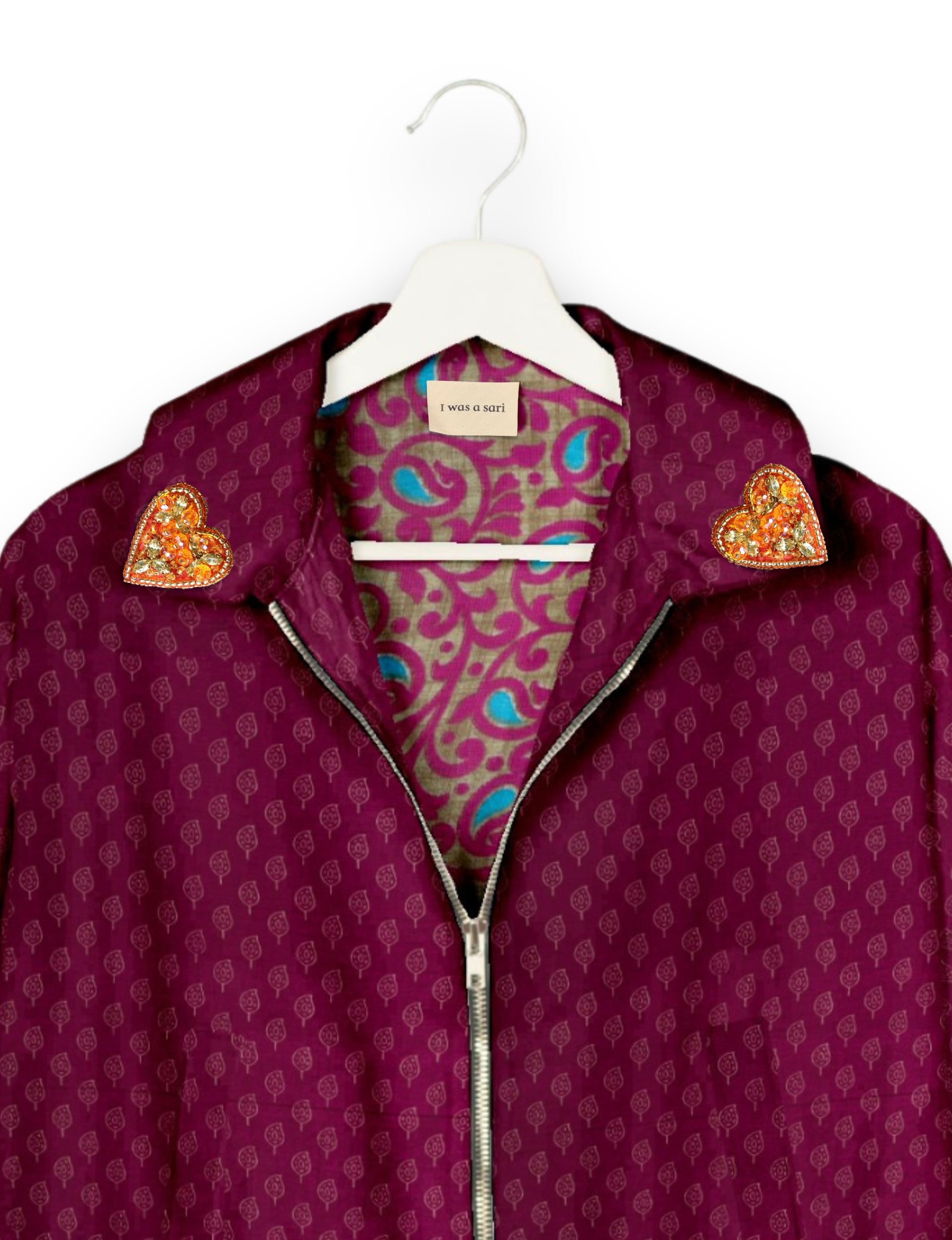 Introducing the Heart Bomber, a limited-edition sustainable fashion statement crafted from upcycled saris. Featuring intricate Aari embroidery hand-stitched by skilled female artisans, this zero waste clothing piece embodies ethical fashion and slow fashion values. Make a conscious choice with this fair trade fashion essential—eco-friendly, repurposed, and made from recycled materials. Elevate your wardrobe with carbon-neutral fashion that tells a story of artistry and sustainability. Lighting and screens may cause slight variations in color appearance.