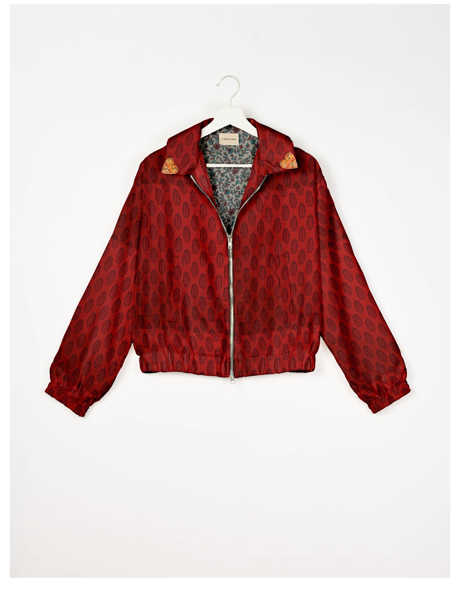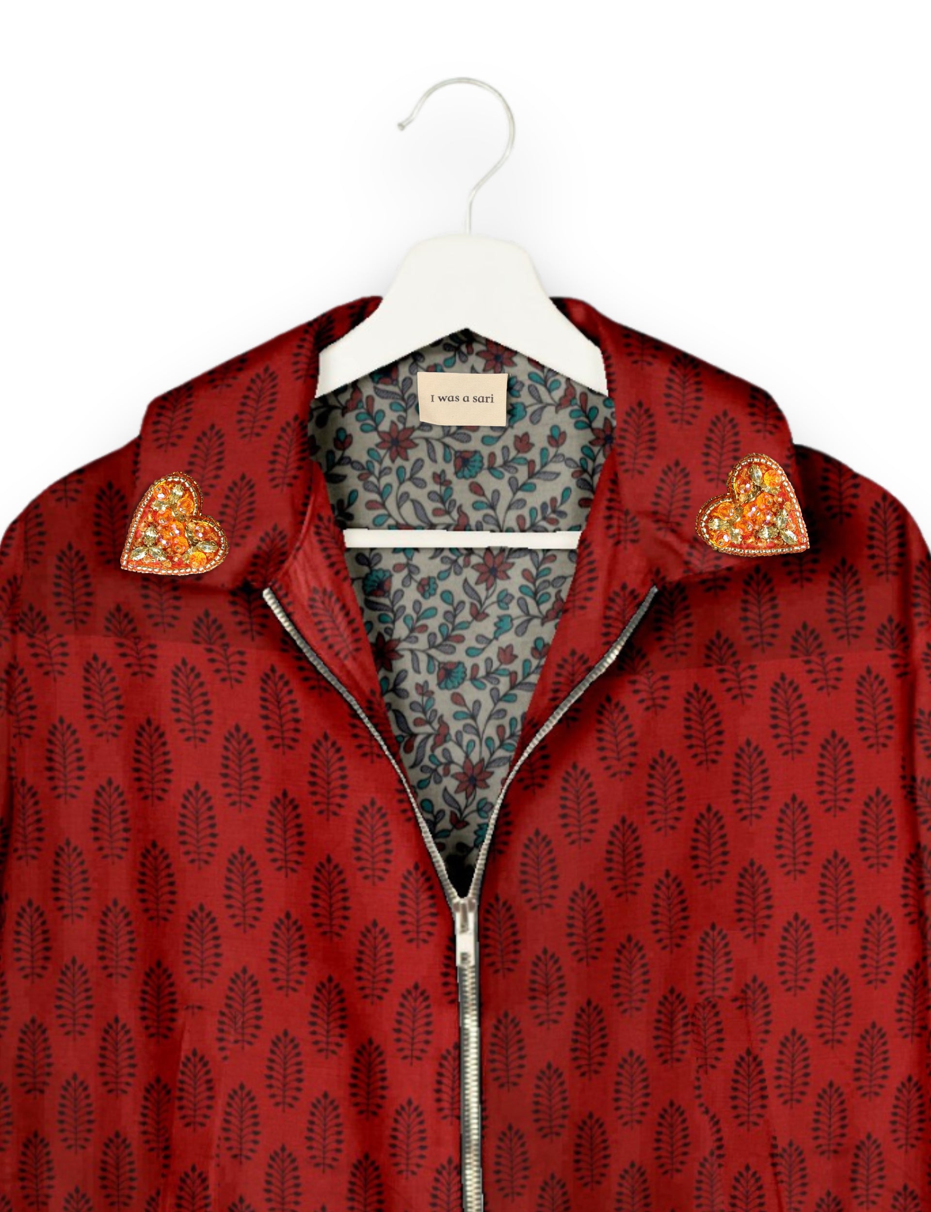 Introducing the Heart Bomber, a limited-edition sustainable fashion statement crafted from upcycled saris. Featuring intricate Aari embroidery hand-stitched by skilled female artisans, this zero waste clothing piece embodies ethical fashion and slow fashion values. Make a conscious choice with this fair trade fashion essential—eco-friendly, repurposed, and made from recycled materials. Elevate your wardrobe with carbon-neutral fashion that tells a story of artistry and sustainability. Lighting and screens may cause slight variations in color appearance.