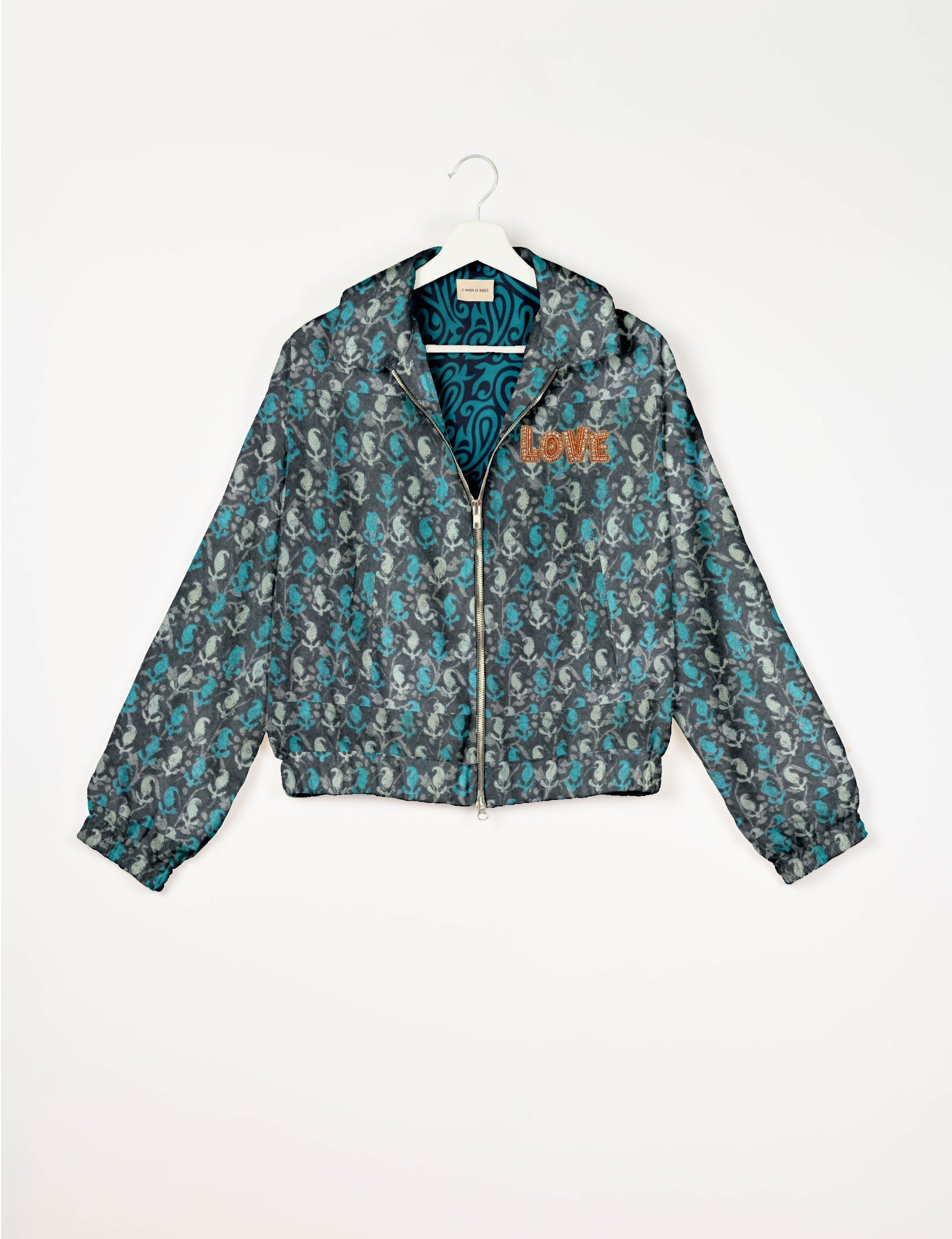 A special edition of the Classic Bomber , elevated with intricate handcrafted Aari embroidery that spells out "Love". And by our female artisans no less. Crafted from upcycled saris, this jacket is more than just a statement piece—it's a wearable story of artistry, tradition, and conscious living.