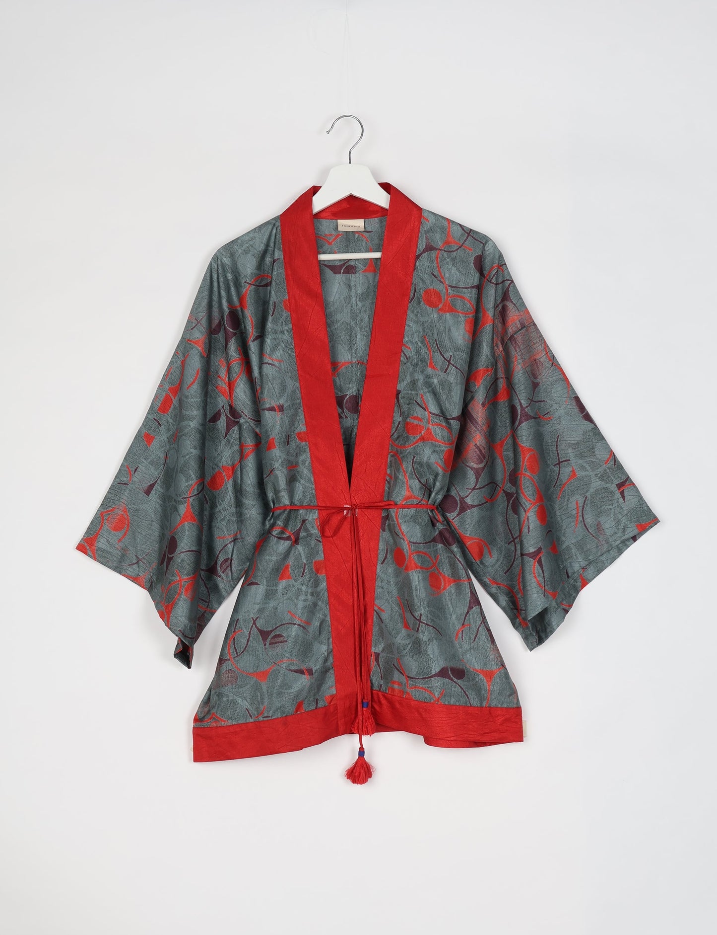Kimono-style robe with a relaxed fit, open front, and contrast borders. Features wide, straight-cut sleeves and comes with a detachable fabric belt with tassels.