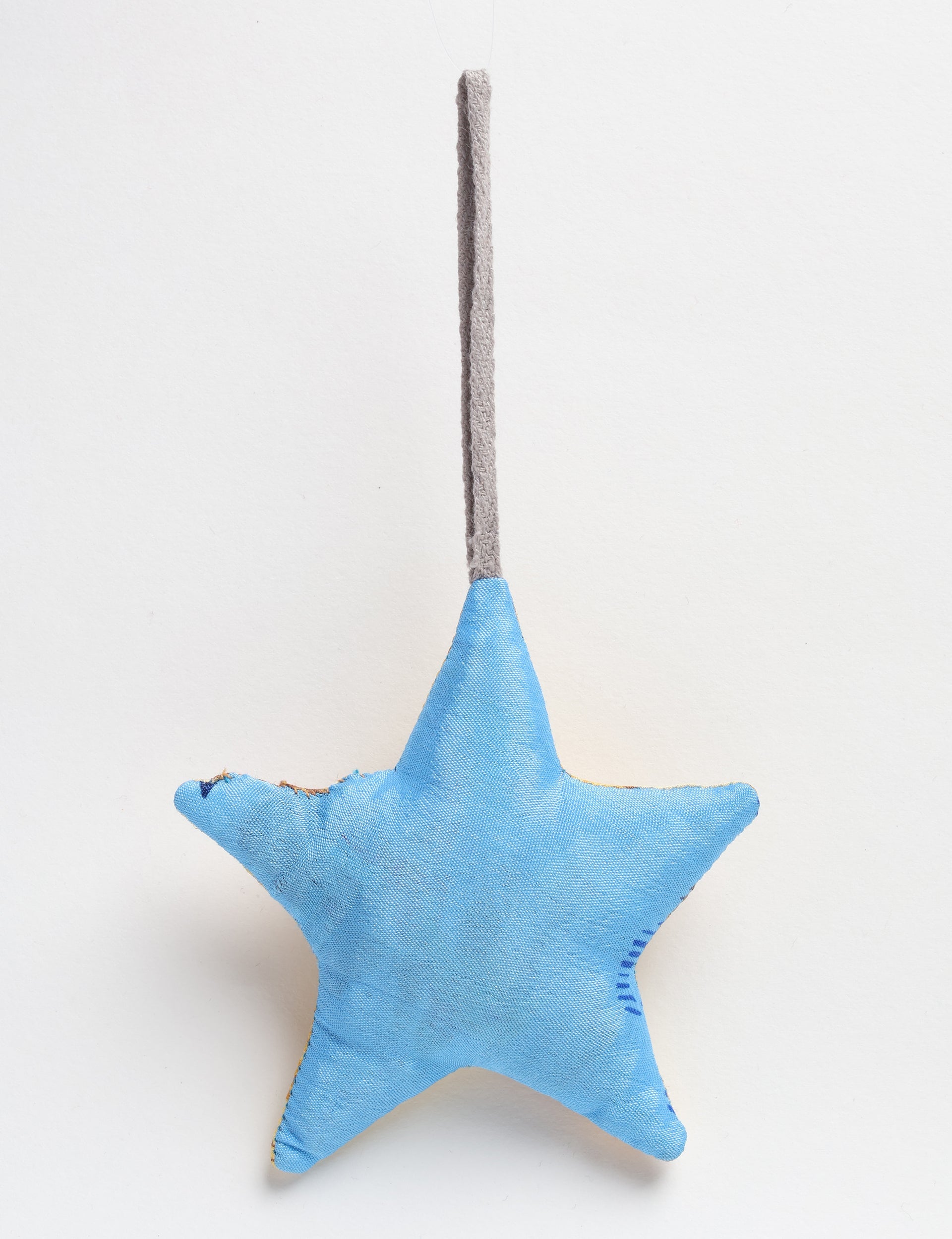 This small star-shaped ornament is constructed using fabric remnants from preloved saris. The outer structure is sewn from upcycled sari textiles, with internal filling composed of soft chindi scraps to provide volume and form. Each unit is hand-stitched, ensuring structural integrity while maintaining a lightweight profile suitable for hanging. Lighting and screens may cause slight variations in color appearance.