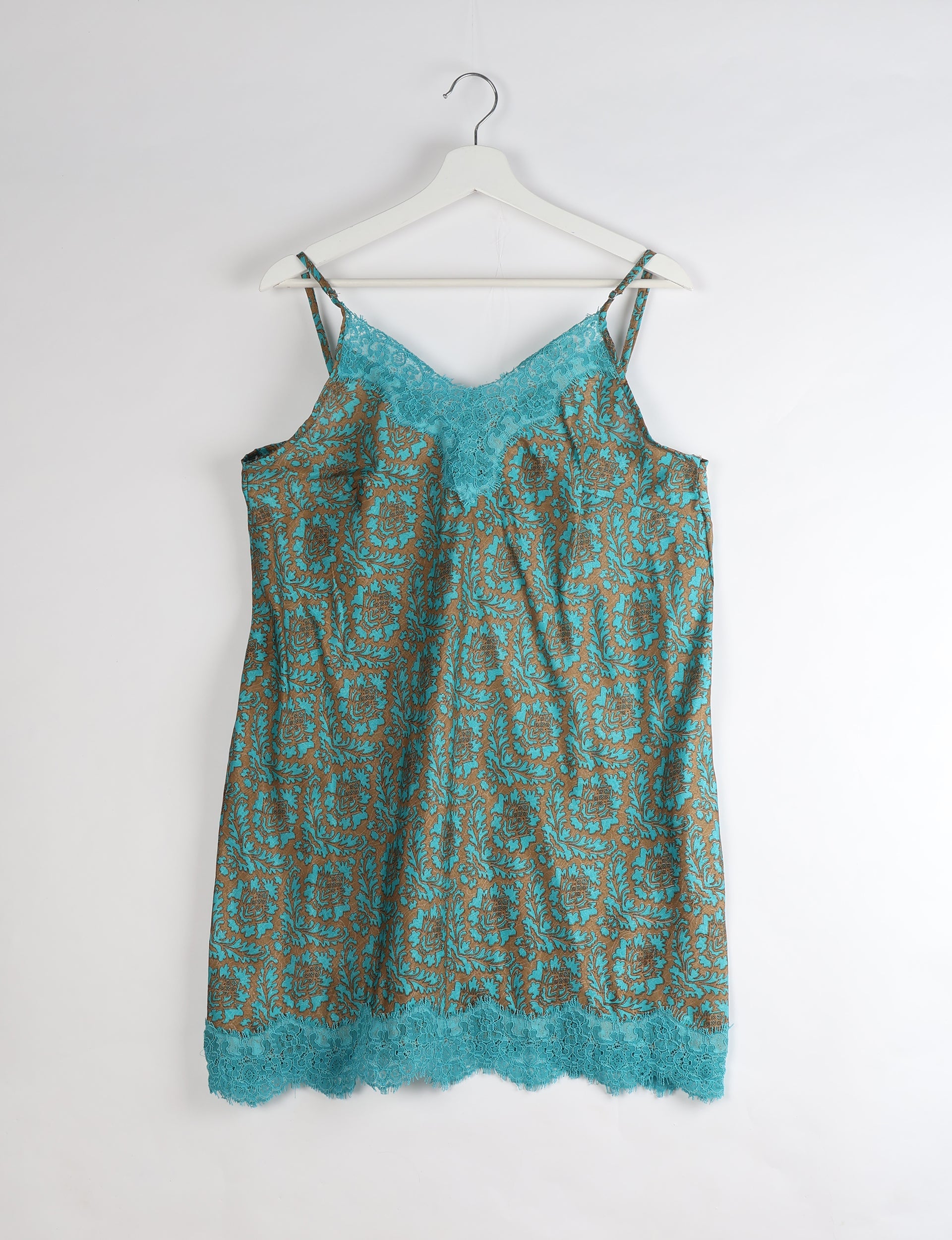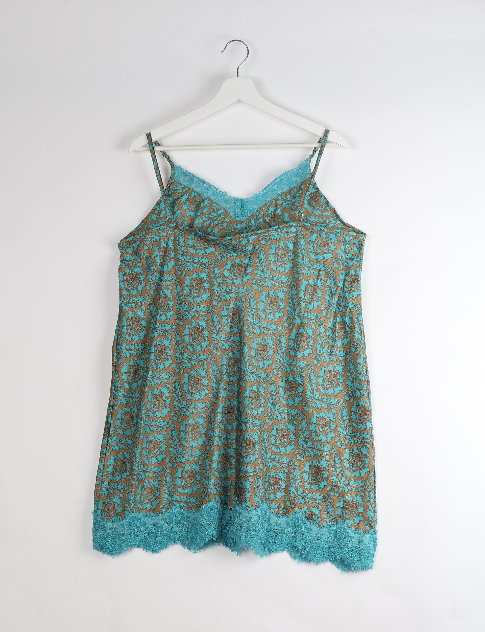 Sleeveless slip dress just falling above the knee with adjustable spaghetti straps. Features a scalloped lace insert at the neckline and a wide lace trim at the hem.