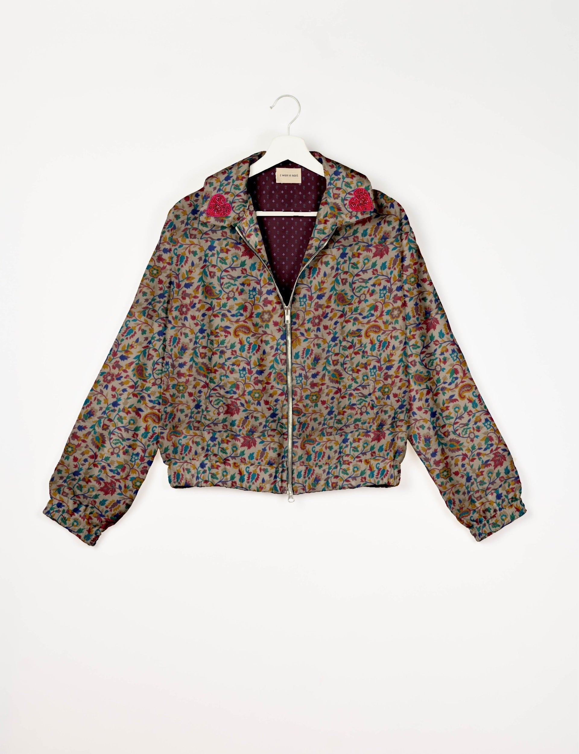 Introducing the Heart Bomber, a limited-edition sustainable fashion statement crafted from upcycled saris. Featuring intricate Aari embroidery hand-stitched by skilled female artisans, this zero waste clothing piece embodies ethical fashion and slow fashion values. Make a conscious choice with this fair trade fashion essential—eco-friendly, repurposed, and made from recycled materials. Elevate your wardrobe with carbon-neutral fashion that tells a story of artistry and sustainability. Lighting and screens may cause slight variations in color appearance.
