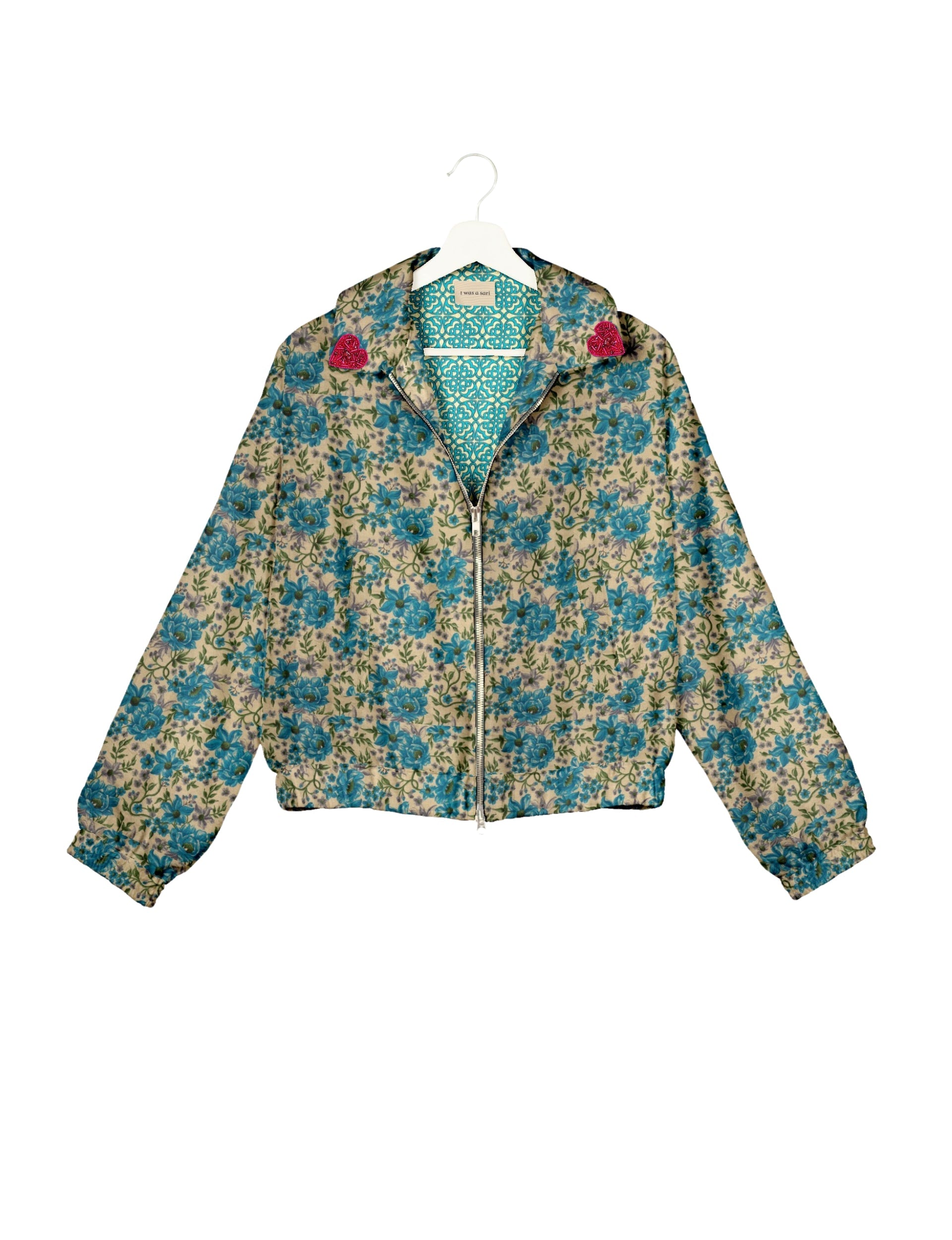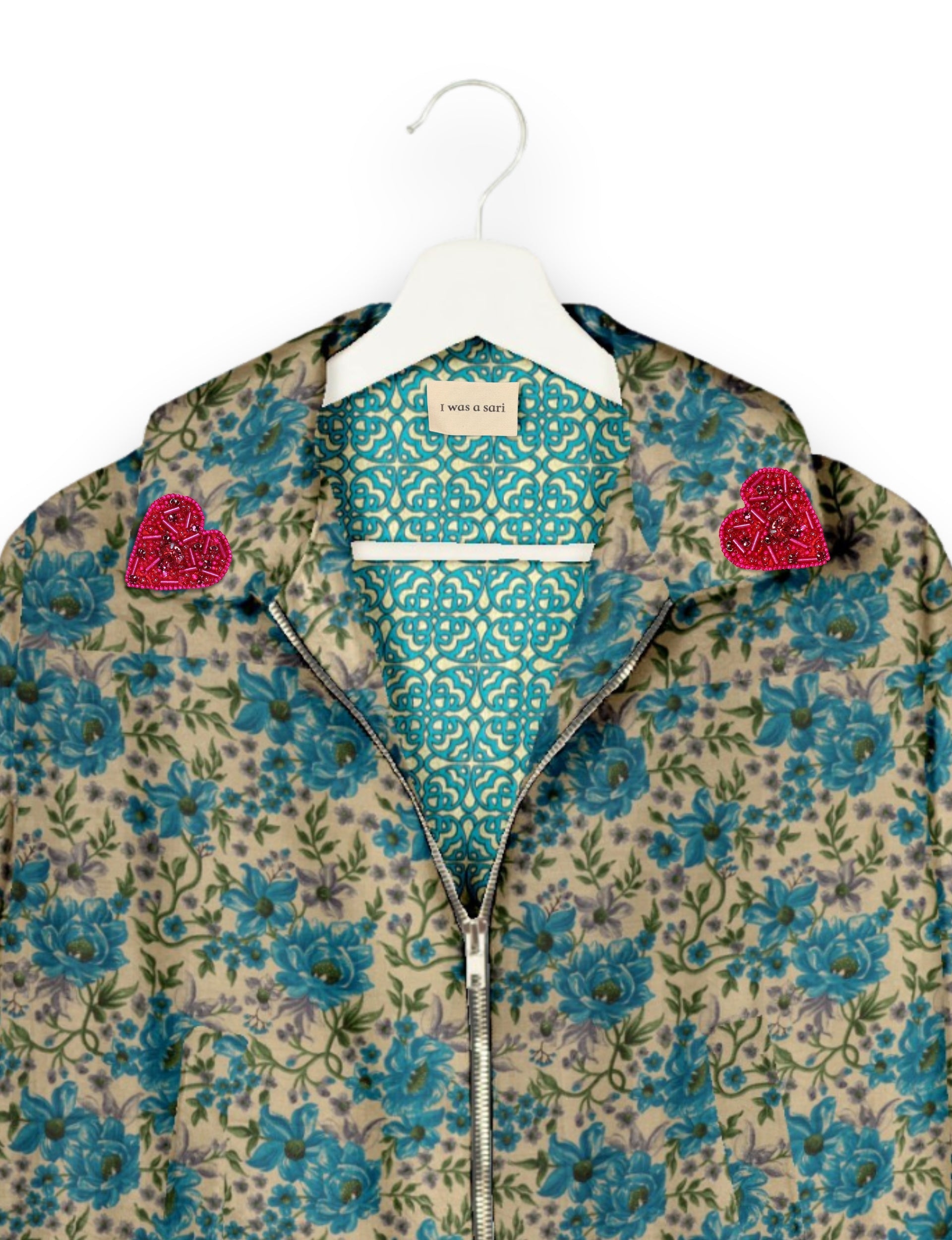 Introducing the Heart Bomber, a limited-edition sustainable fashion statement crafted from upcycled saris. Featuring intricate Aari embroidery hand-stitched by skilled female artisans, this zero waste clothing piece embodies ethical fashion and slow fashion values. Make a conscious choice with this fair trade fashion essential—eco-friendly, repurposed, and made from recycled materials. Elevate your wardrobe with carbon-neutral fashion that tells a story of artistry and sustainability. Lighting and screens may cause slight variations in color appearance.