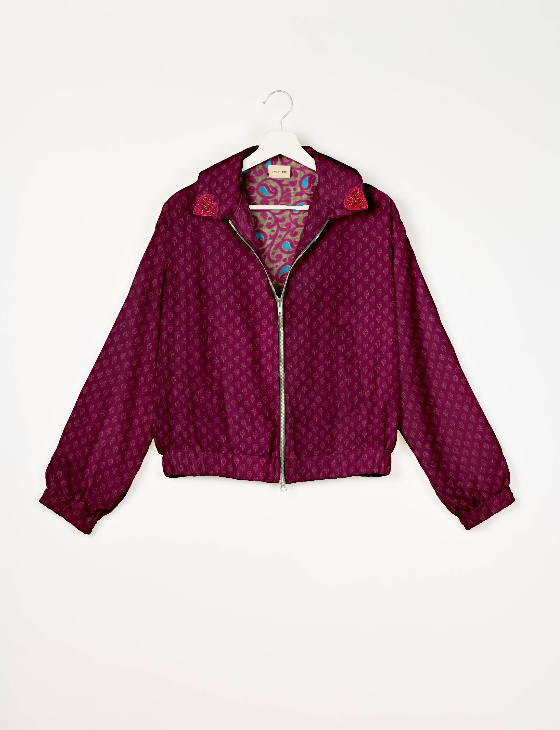 Introducing the Heart Bomber, a limited-edition sustainable fashion statement crafted from upcycled saris. Featuring intricate Aari embroidery hand-stitched by skilled female artisans, this zero waste clothing piece embodies ethical fashion and slow fashion values. Make a conscious choice with this fair trade fashion essential—eco-friendly, repurposed, and made from recycled materials. Elevate your wardrobe with carbon-neutral fashion that tells a story of artistry and sustainability. Lighting and screens may cause slight variations in color appearance.