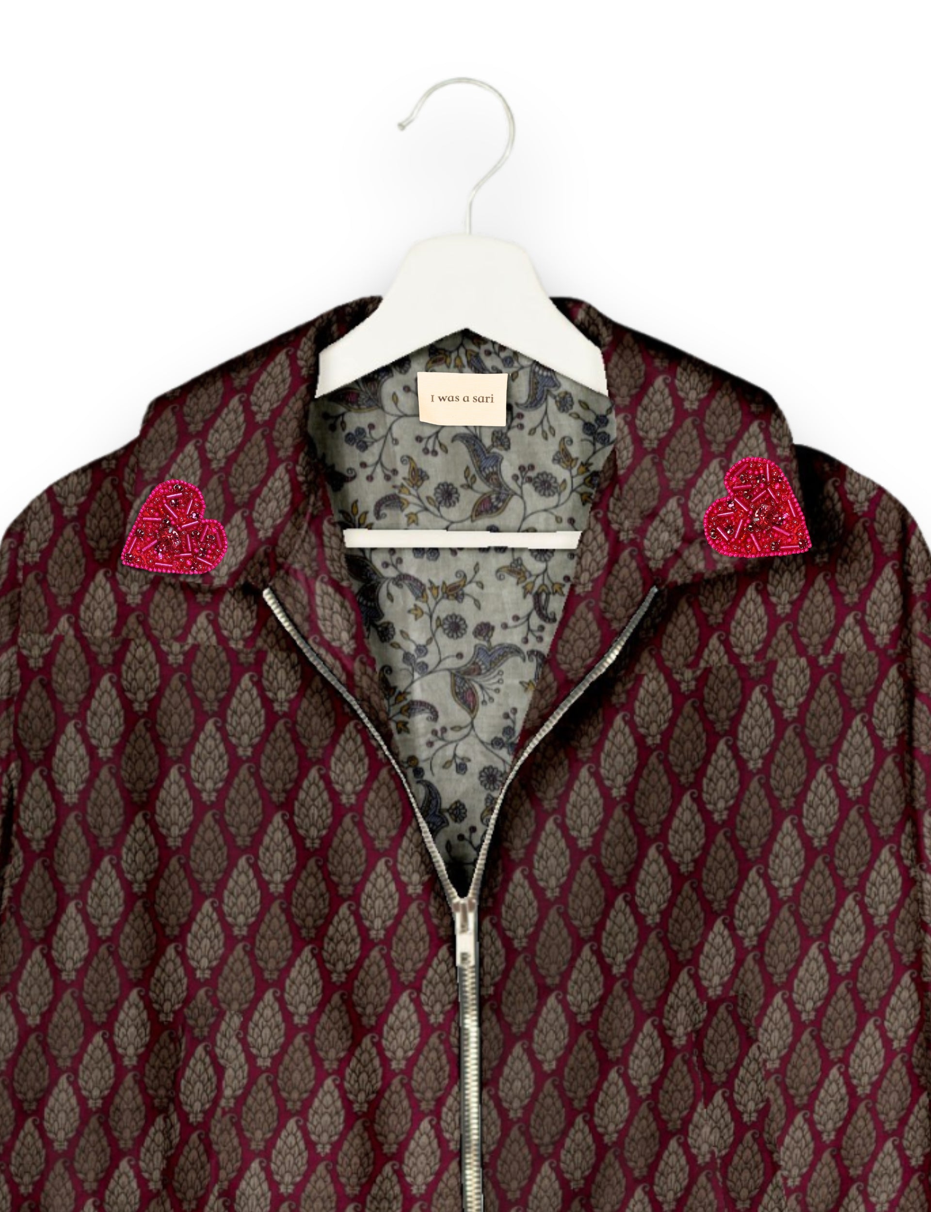 Introducing the Heart Bomber, a limited-edition sustainable fashion statement crafted from upcycled saris. Featuring intricate Aari embroidery hand-stitched by skilled female artisans, this zero waste clothing piece embodies ethical fashion and slow fashion values. Make a conscious choice with this fair trade fashion essential—eco-friendly, repurposed, and made from recycled materials. Elevate your wardrobe with carbon-neutral fashion that tells a story of artistry and sustainability. Lighting and screens may cause slight variations in color appearance.