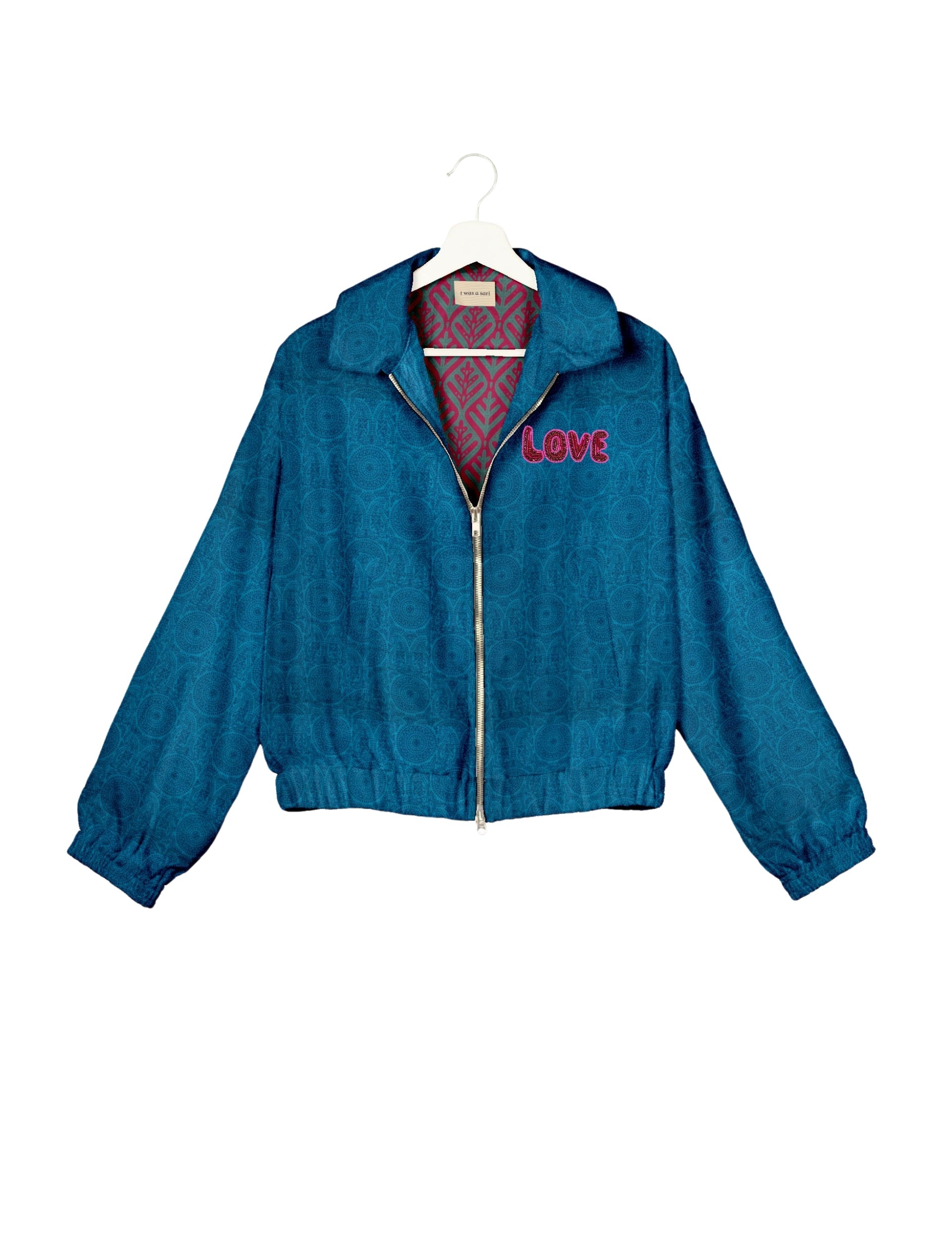 A special edition of the Classic Bomber , elevated with intricate handcrafted Aari embroidery that spells out "Love". And by our female artisans no less. Crafted from upcycled saris, this jacket is more than just a statement piece—it's a wearable story of artistry, tradition, and conscious living.