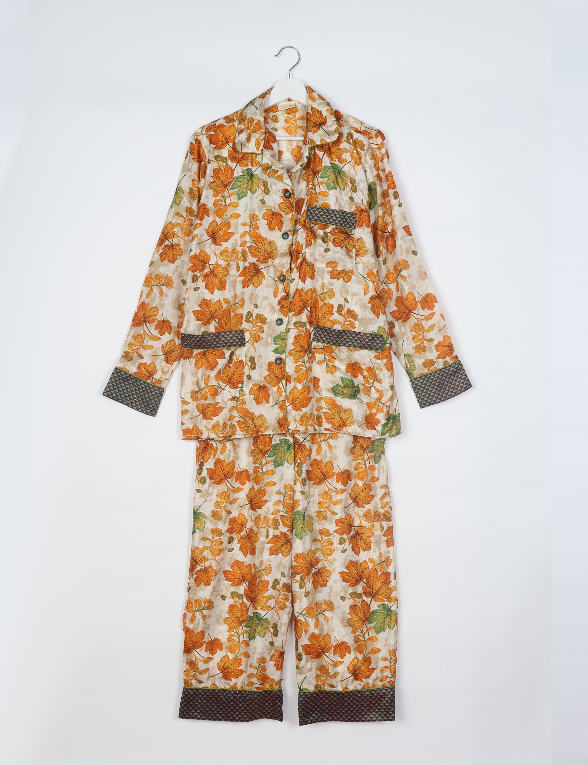 Two-piece coordinated pyjama set consisting of a full-sleeve button-down shirt and relaxed straight-leg pants. The shirt features notch lapels, contrast piping, front patch pockets, and a button down placket. The pants have an elasticated waistband with button closure. Both top and bottom are finished with printed contrast hems.