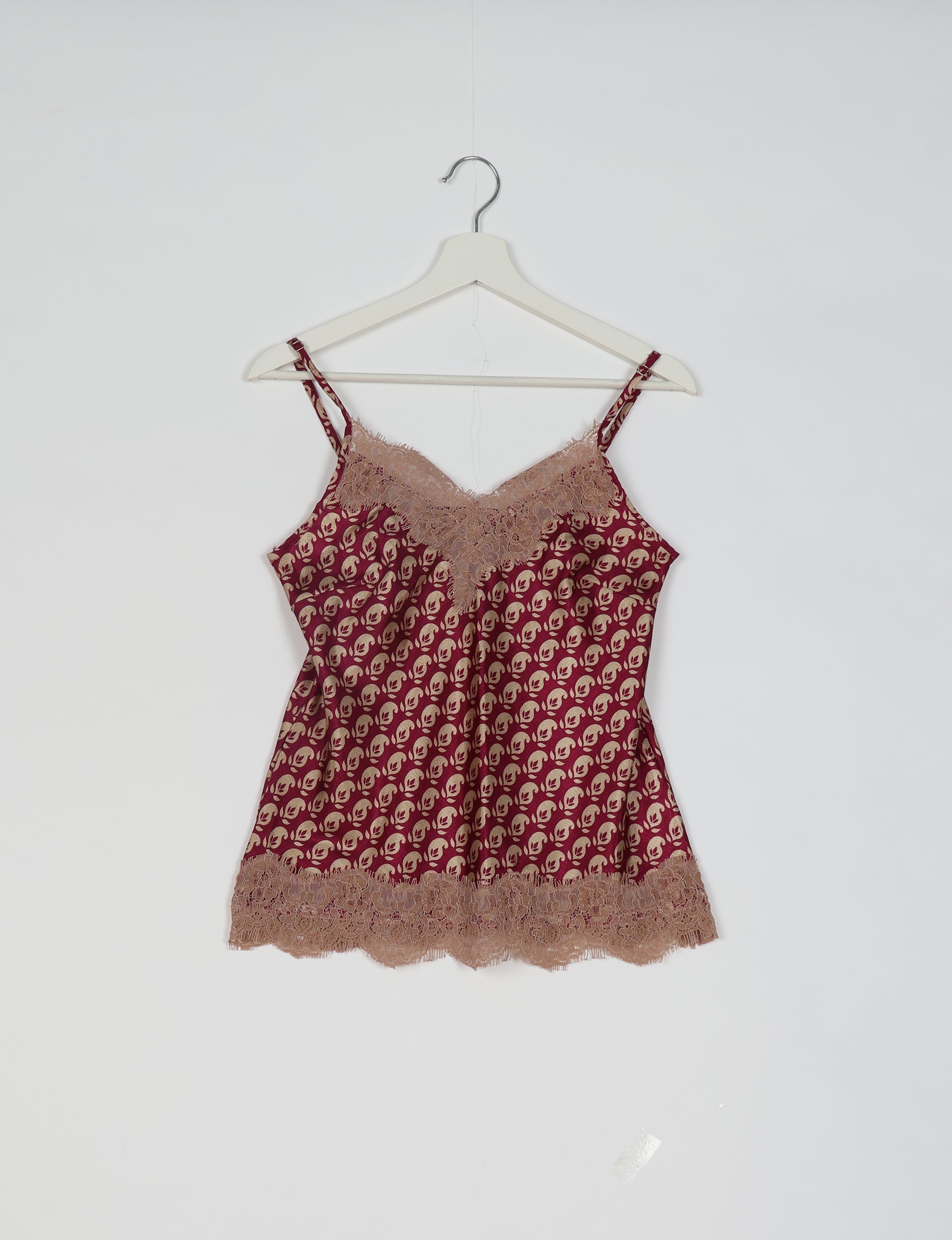 Two-piece sleepwear set consisting of a camisole top and straight-fit pants. The camisole features adjustable spaghetti straps and is finished with lace trim along the neckline and hem. The pants have a relaxed fit with an elasticated waist.