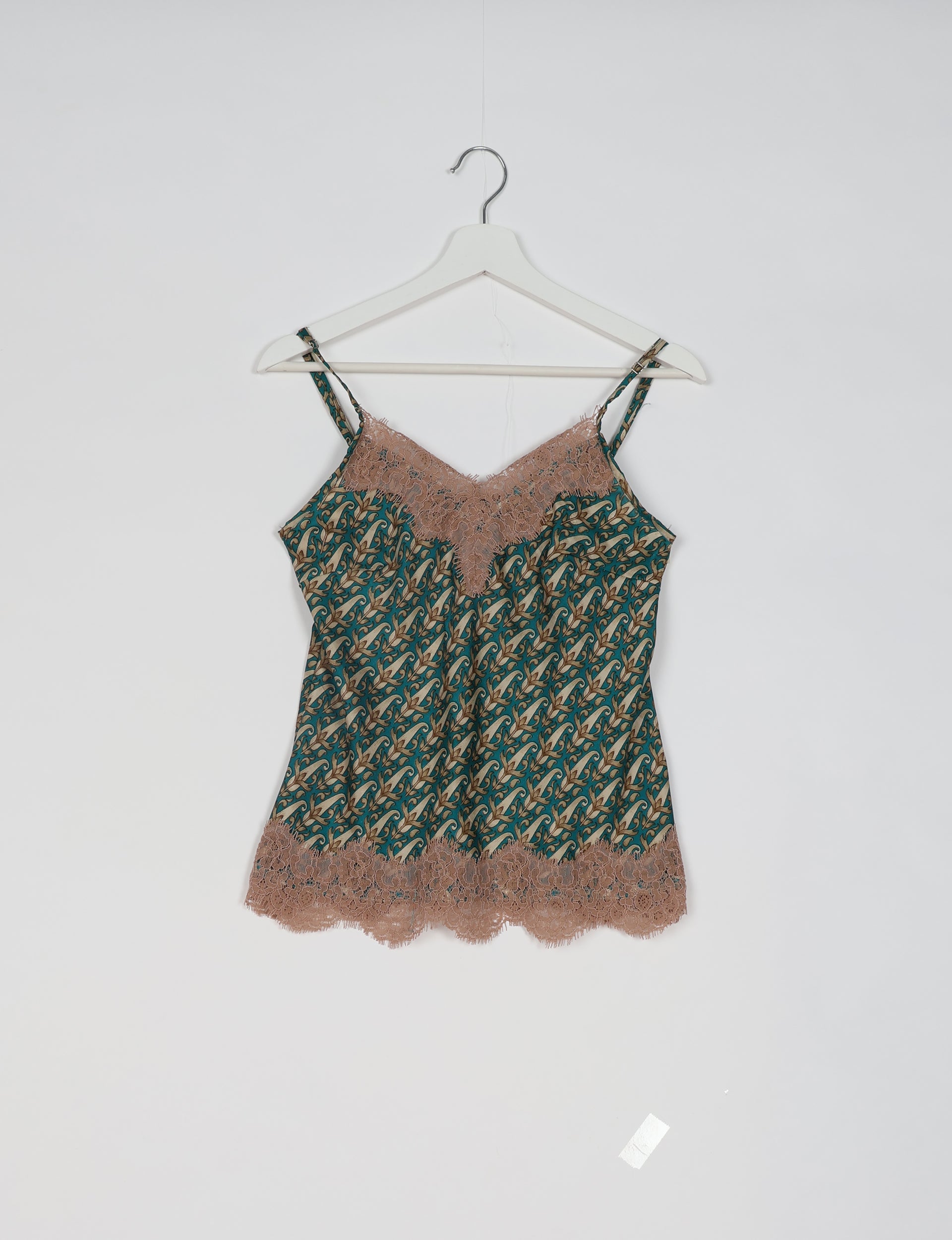 Two-piece sleepwear set consisting of a camisole top and straight-fit pants. The camisole features adjustable spaghetti straps and is finished with lace trim along the neckline and hem. The pants have a relaxed fit with an elasticated waist.