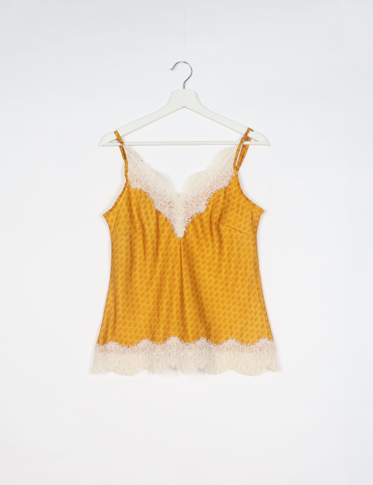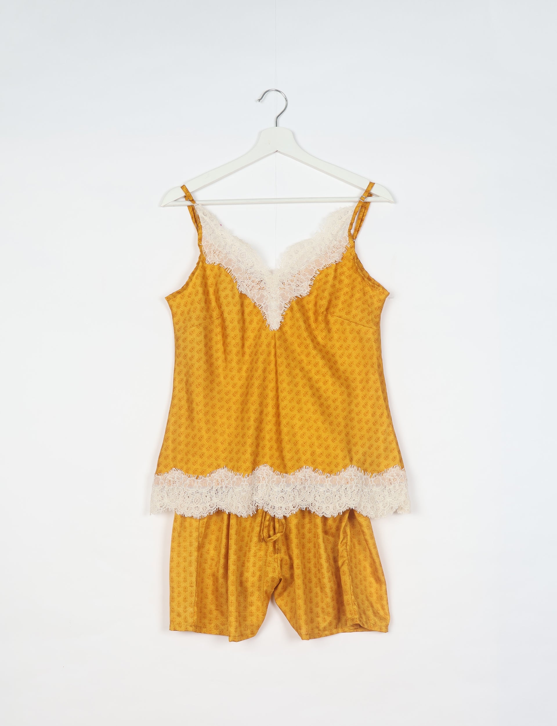Two-piece loungewear set consisting of a camisole and matching shorts. The cami features a V-neckline, thin adjustable shoulder straps, and is trimmed with eyelash lace along the neckline and hem. The shorts have an elasticated waistband with a functional drawstring and a soft, straight-leg silhouette.