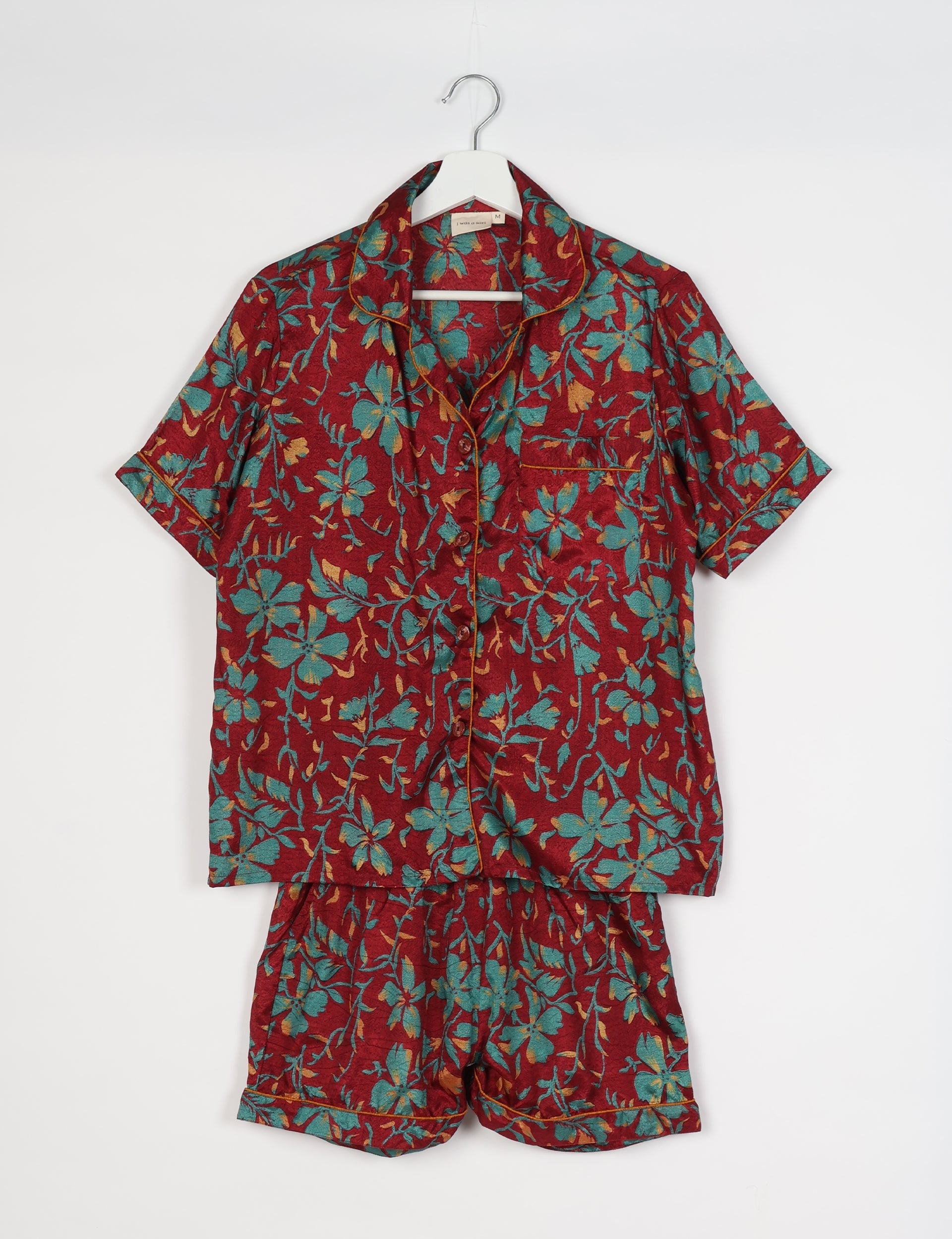 Two-piece nightwear set including a short-sleeved shirt and elasticated shorts. The shirt features a notched collar, front button closure with buttons, and a single chest pocket with contrast trim detail. The shorts have an elasticated waistband and contrast hem cuffs. Lighting and screens may cause slight variations in color appearance.