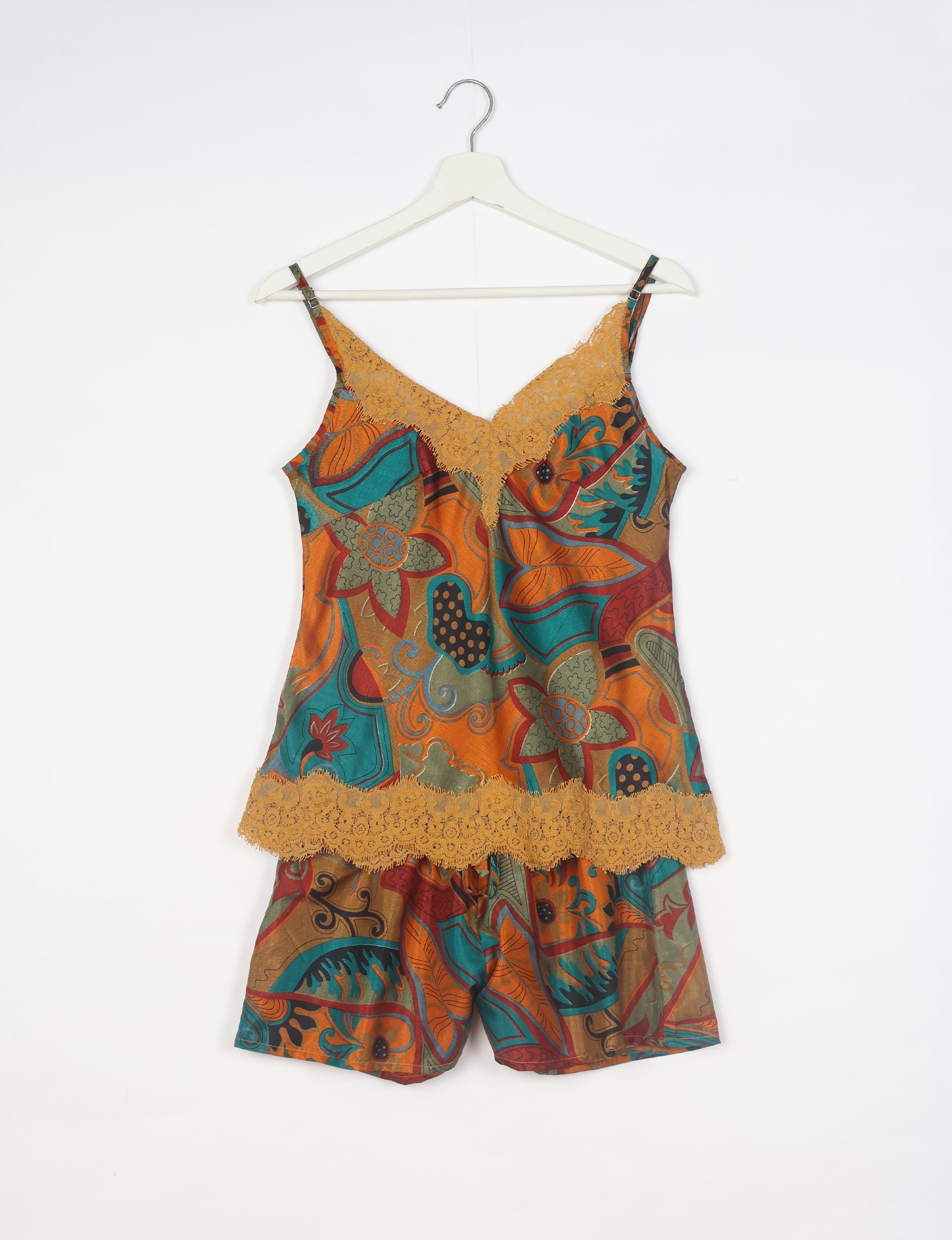 Two-piece loungewear set consisting of a camisole and matching shorts. The cami features a V-neckline, thin adjustable shoulder straps, and is trimmed with eyelash lace along the neckline and hem. The shorts have an elasticated waistband with a functional drawstring and a soft, straight-leg silhouette.