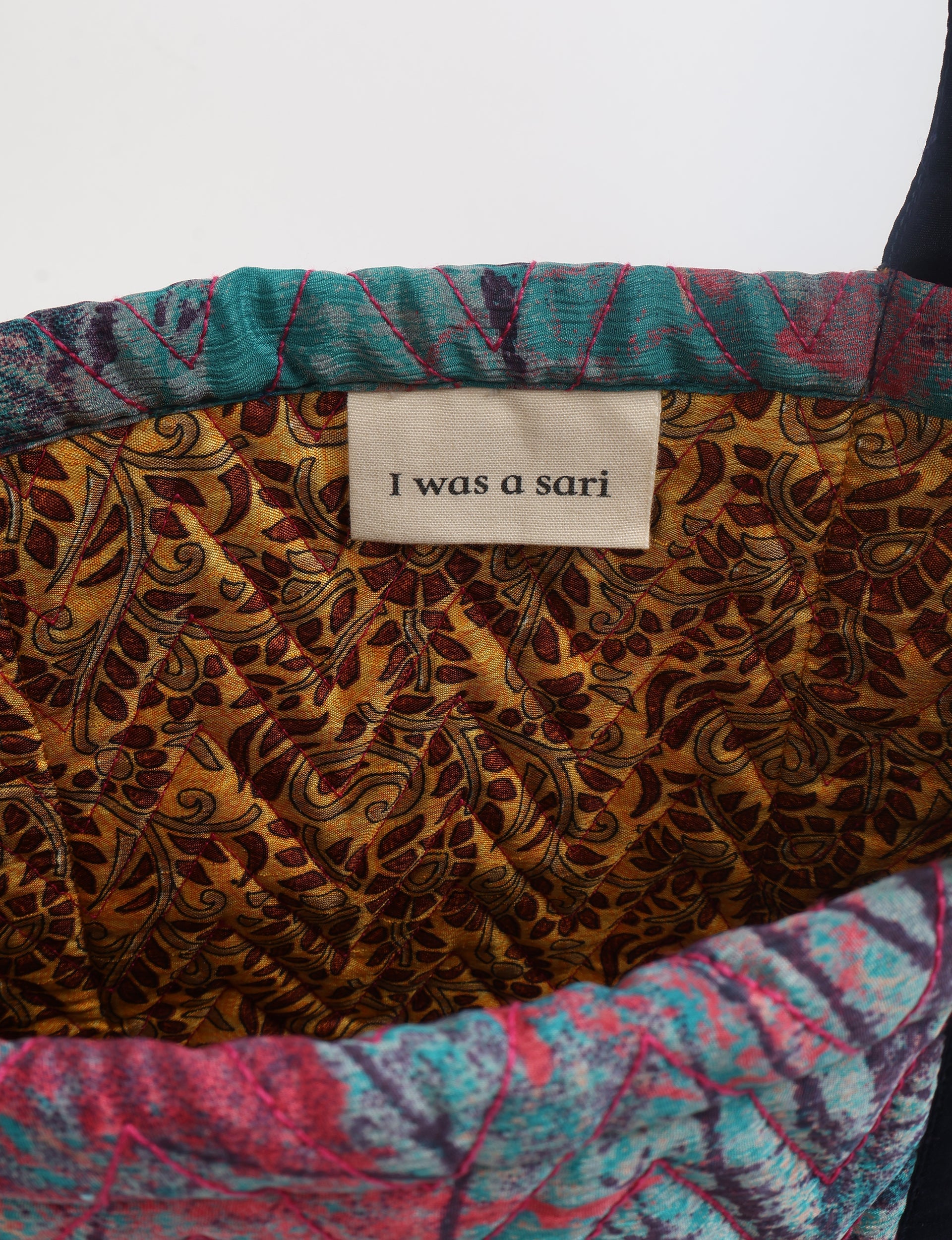 A spacious, reinforced tote featuring chevron quilted sari panels for added softness and durability. The fabric straps offer visual contrast and are designed to be comfortably worn over the shoulder or carried by hand. The interior includes a sari lining in a distinct, often contrasting print. Lighting and screens may cause slight variations in color appearance.