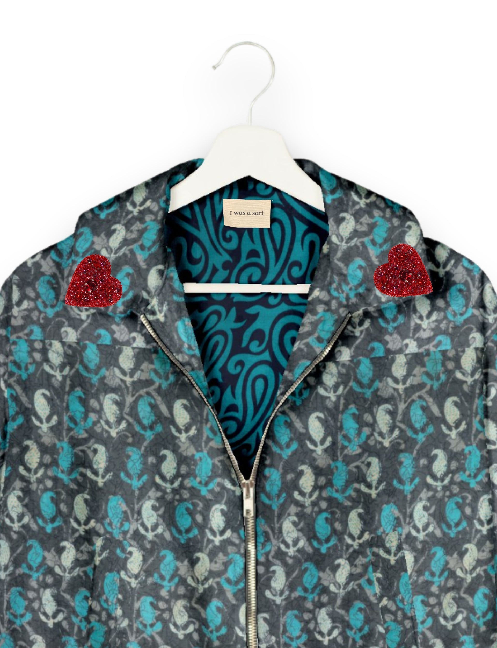 Introducing the Heart Bomber, a limited-edition sustainable fashion statement crafted from upcycled saris. Featuring intricate Aari embroidery hand-stitched by skilled female artisans, this zero waste clothing piece embodies ethical fashion and slow fashion values. Make a conscious choice with this fair trade fashion essential—eco-friendly, repurposed, and made from recycled materials. Elevate your wardrobe with carbon-neutral fashion that tells a story of artistry and sustainability. Lighting and screens may cause slight variations in color appearance.