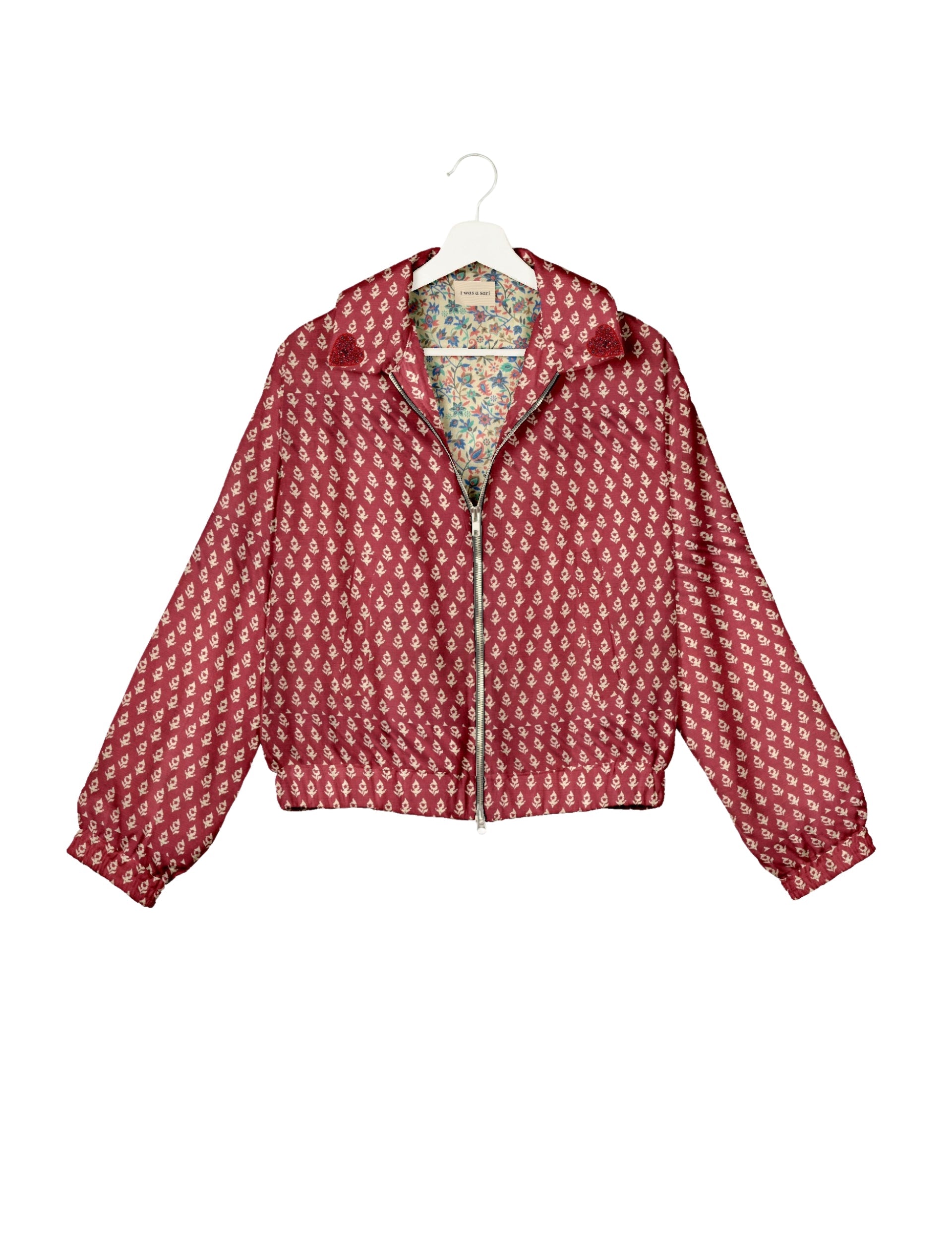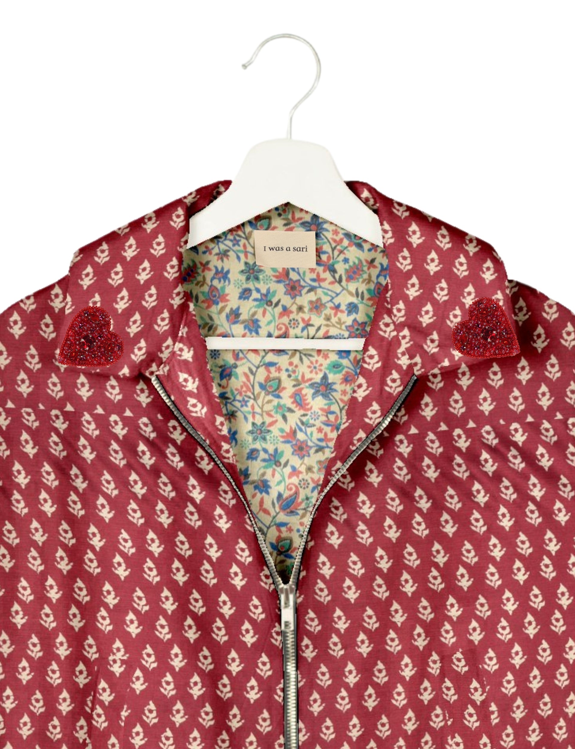 Introducing the Heart Bomber, a limited-edition sustainable fashion statement crafted from upcycled saris. Featuring intricate Aari embroidery hand-stitched by skilled female artisans, this zero waste clothing piece embodies ethical fashion and slow fashion values. Make a conscious choice with this fair trade fashion essential—eco-friendly, repurposed, and made from recycled materials. Elevate your wardrobe with carbon-neutral fashion that tells a story of artistry and sustainability. Lighting and screens may cause slight variations in color appearance.
