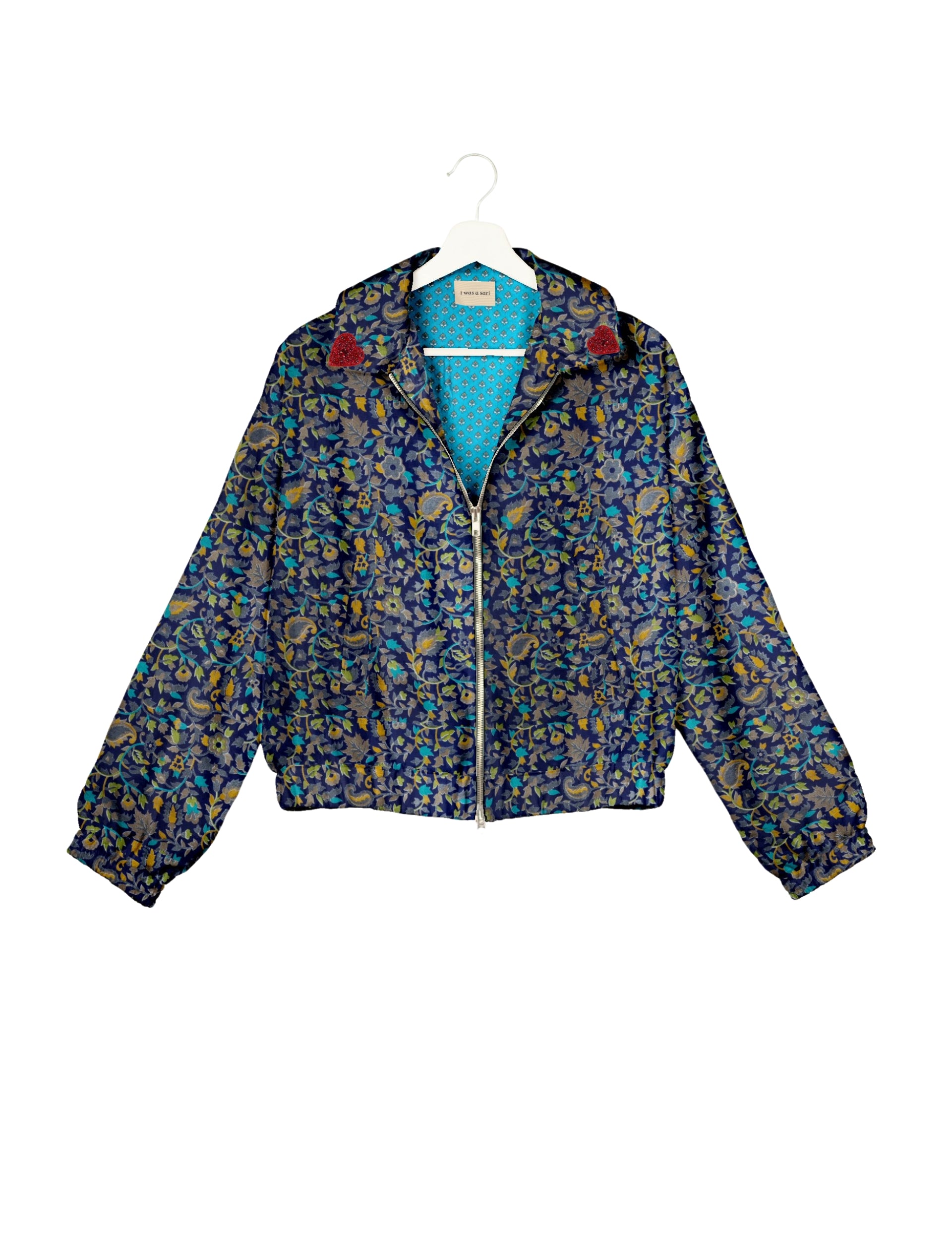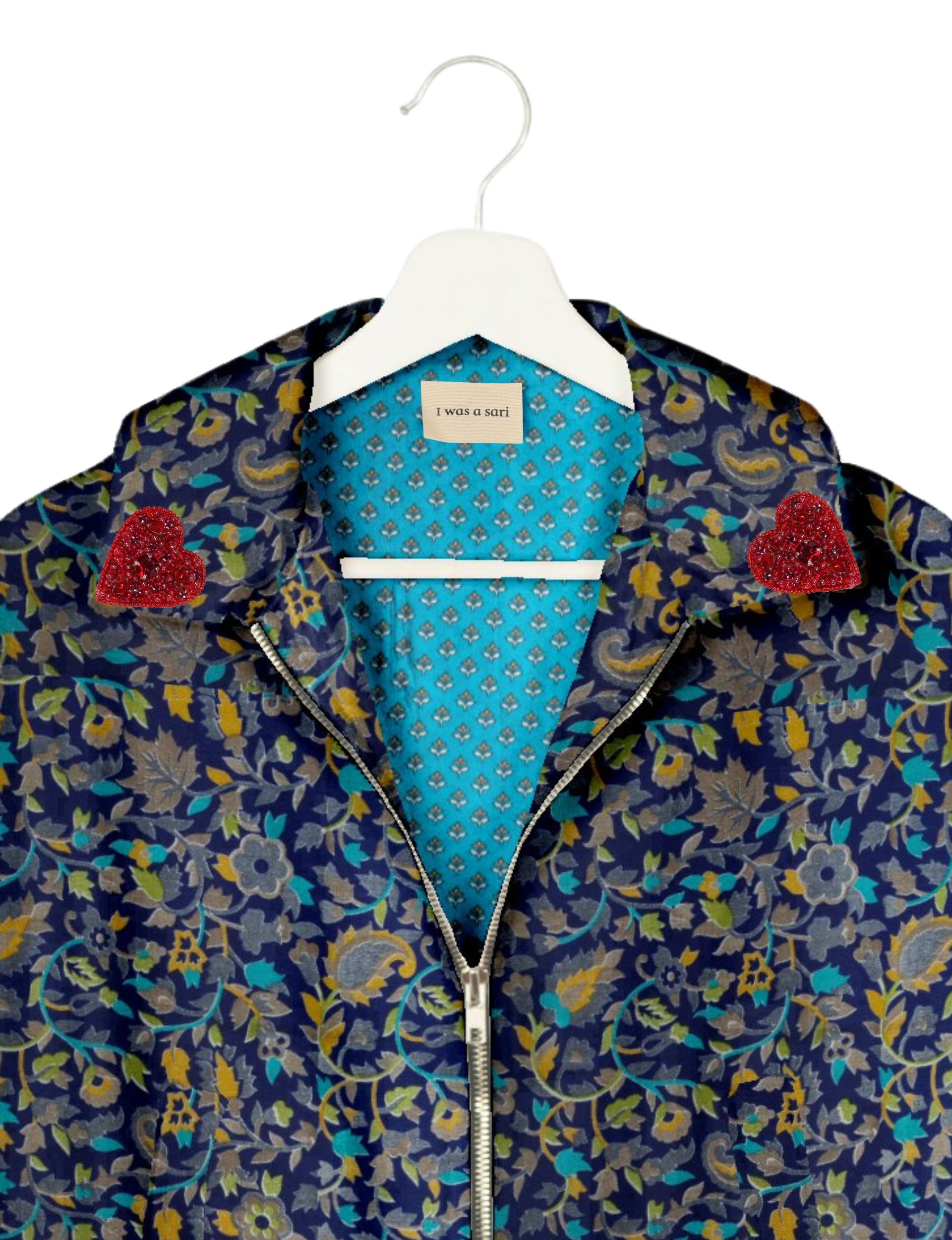 Introducing the Heart Bomber, a limited-edition sustainable fashion statement crafted from upcycled saris. Featuring intricate Aari embroidery hand-stitched by skilled female artisans, this zero waste clothing piece embodies ethical fashion and slow fashion values. Make a conscious choice with this fair trade fashion essential—eco-friendly, repurposed, and made from recycled materials. Elevate your wardrobe with carbon-neutral fashion that tells a story of artistry and sustainability. Lighting and screens may cause slight variations in color appearance.