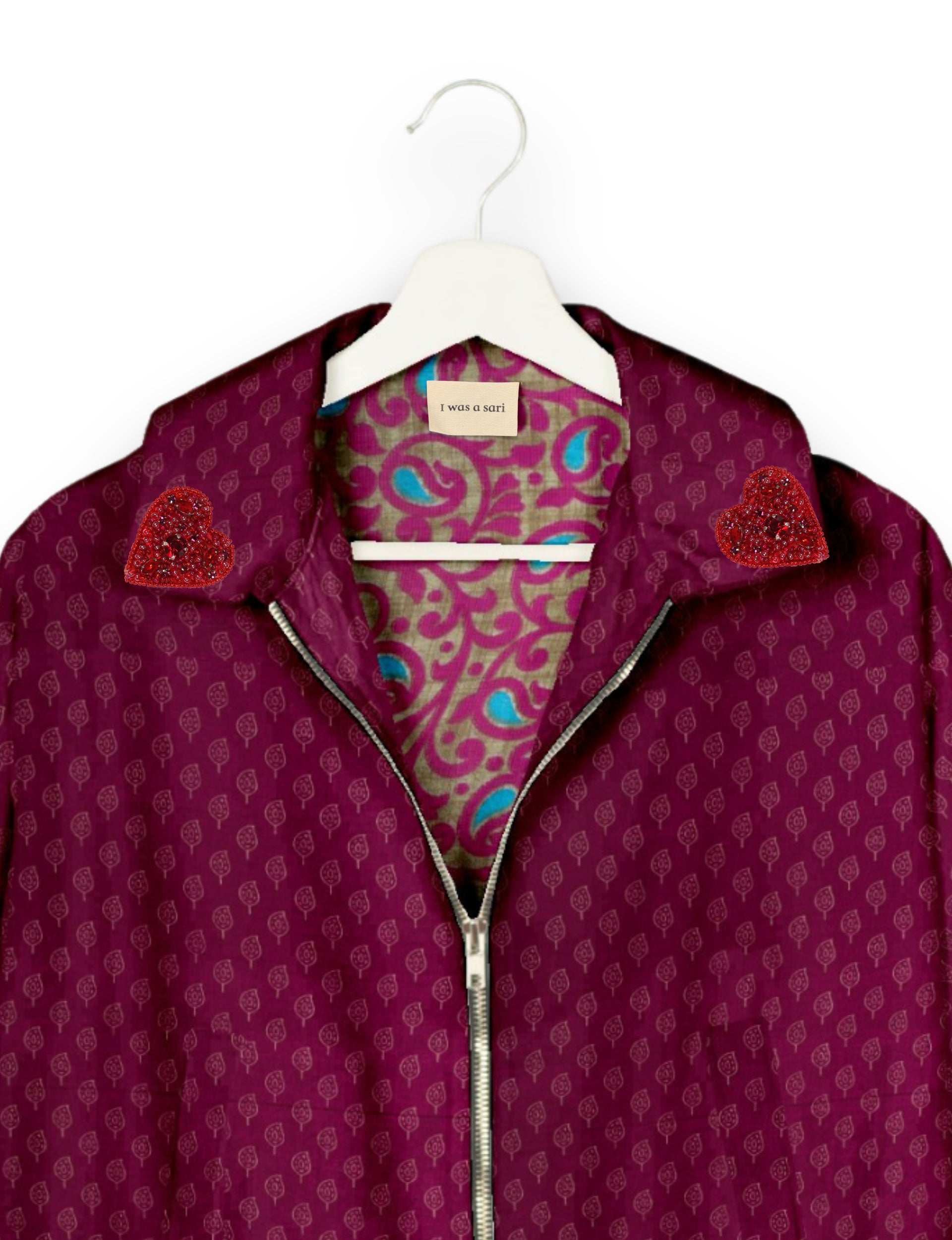Introducing the Heart Bomber, a limited-edition sustainable fashion statement crafted from upcycled saris. Featuring intricate Aari embroidery hand-stitched by skilled female artisans, this zero waste clothing piece embodies ethical fashion and slow fashion values. Make a conscious choice with this fair trade fashion essential—eco-friendly, repurposed, and made from recycled materials. Elevate your wardrobe with carbon-neutral fashion that tells a story of artistry and sustainability. Lighting and screens may cause slight variations in color appearance.