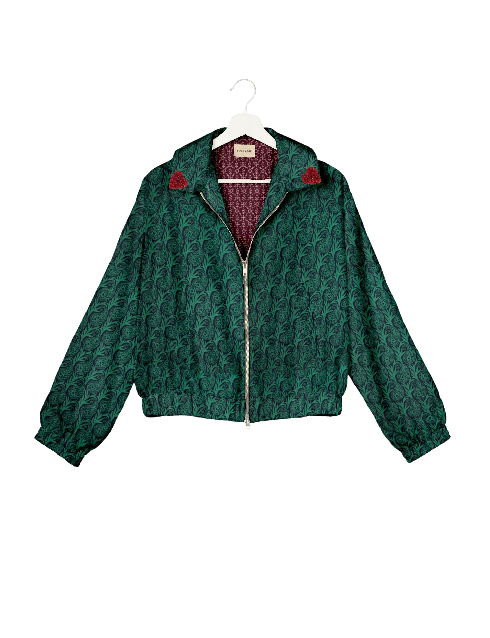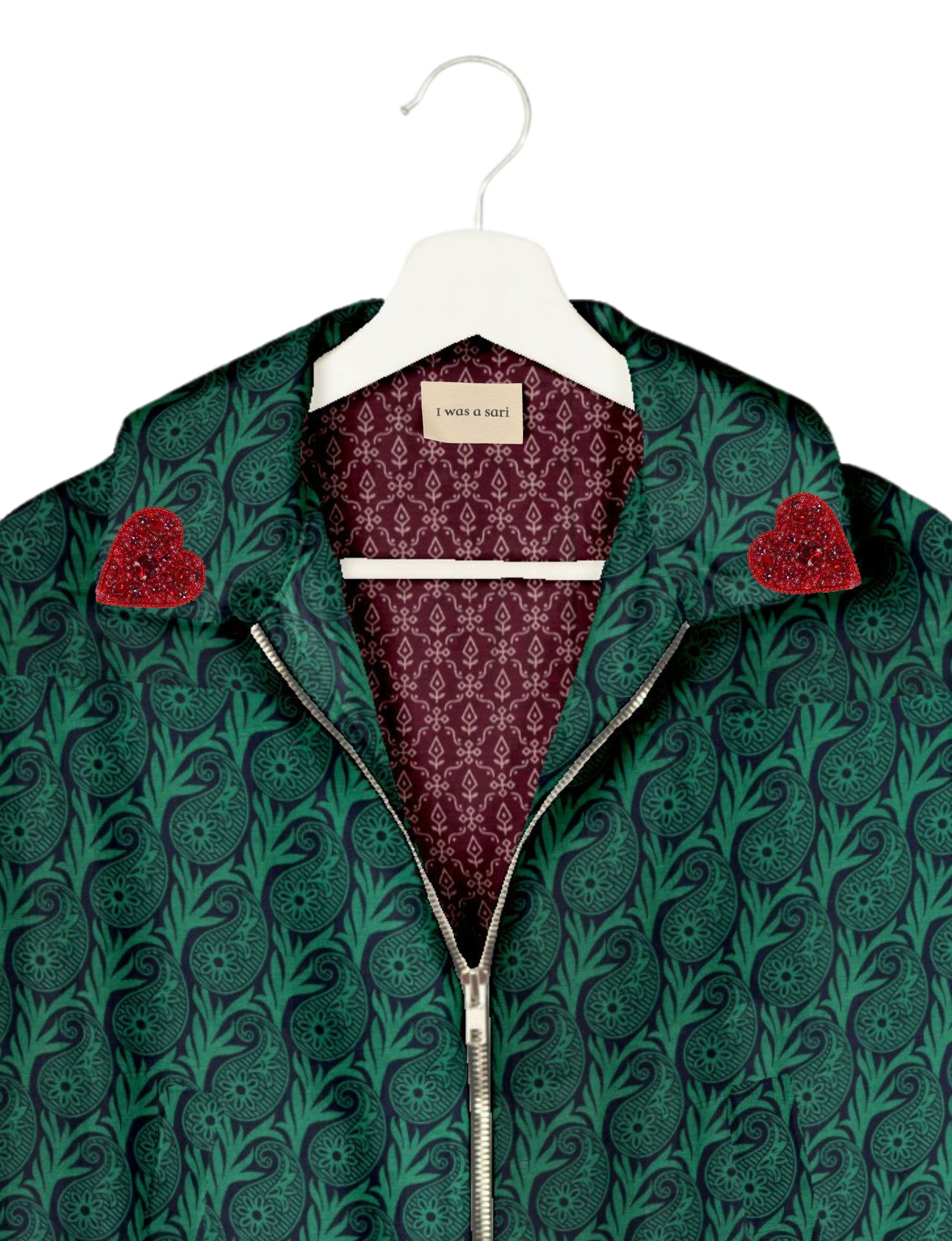 Introducing the Heart Bomber, a limited-edition sustainable fashion statement crafted from upcycled saris. Featuring intricate Aari embroidery hand-stitched by skilled female artisans, this zero waste clothing piece embodies ethical fashion and slow fashion values. Make a conscious choice with this fair trade fashion essential—eco-friendly, repurposed, and made from recycled materials. Elevate your wardrobe with carbon-neutral fashion that tells a story of artistry and sustainability. Lighting and screens may cause slight variations in color appearance.