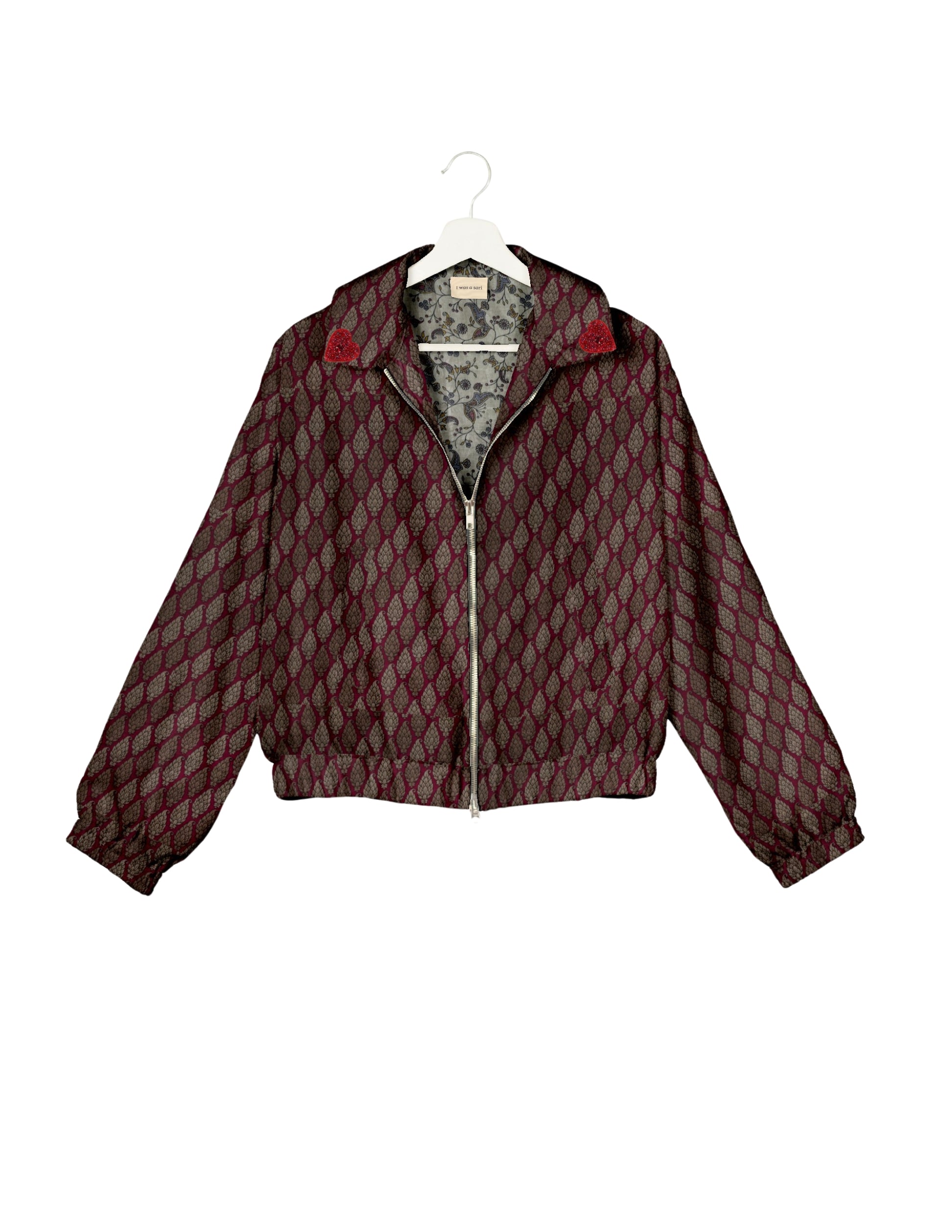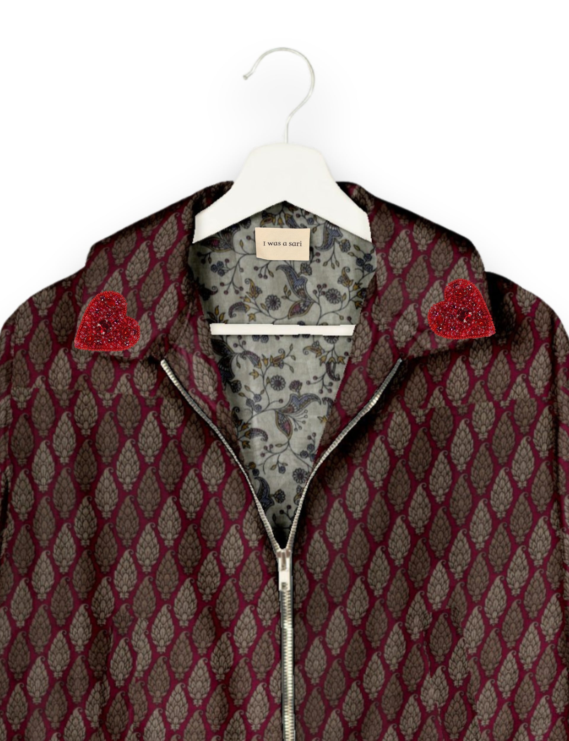Introducing the Heart Bomber, a limited-edition sustainable fashion statement crafted from upcycled saris. Featuring intricate Aari embroidery hand-stitched by skilled female artisans, this zero waste clothing piece embodies ethical fashion and slow fashion values. Make a conscious choice with this fair trade fashion essential—eco-friendly, repurposed, and made from recycled materials. Elevate your wardrobe with carbon-neutral fashion that tells a story of artistry and sustainability. Lighting and screens may cause slight variations in color appearance.