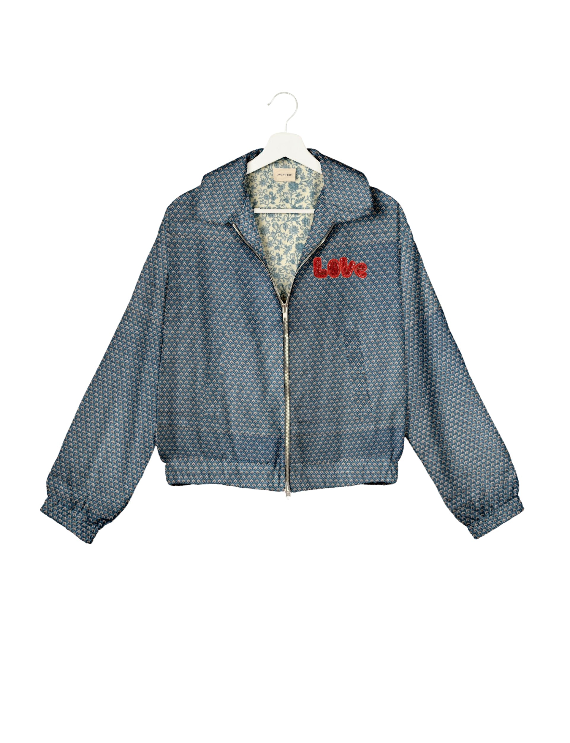 A special edition of the Classic Bomber , elevated with intricate handcrafted Aari embroidery that spells out "Love". And by our female artisans no less. Crafted from upcycled saris, this jacket is more than just a statement piece—it's a wearable story of artistry, tradition, and conscious living.