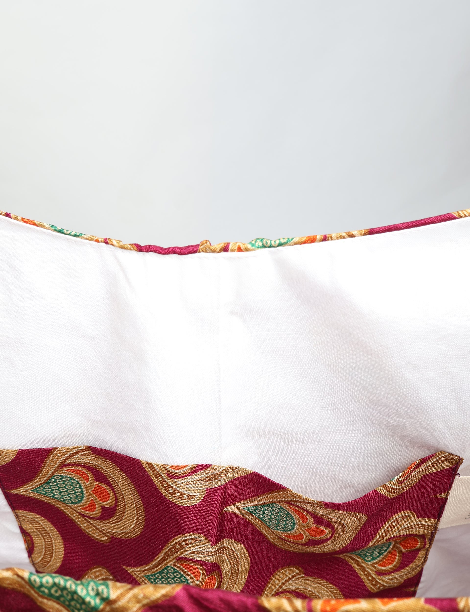 I'm not made from virgin fabrics and dyes, so my carbon footprint, pollution and water usage is way lower than other products. Instead, I'm made with circular production methods, from waste fabric which already existed. I turned into an I was a Sari instead of becoming landfill. Now I'm looking forward to my second life, maybe with you.