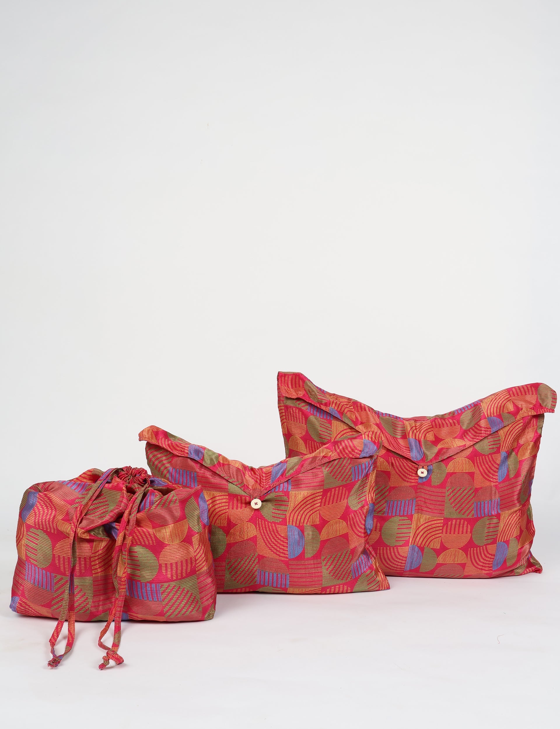 A lightweight 3-piece travel pouch featuring a foldover loop and button closure while the smallest one has a drawstrong closure. Pouches are of increasing size to nest or store flat. Lighting and screens may cause slight variations in color appearance.